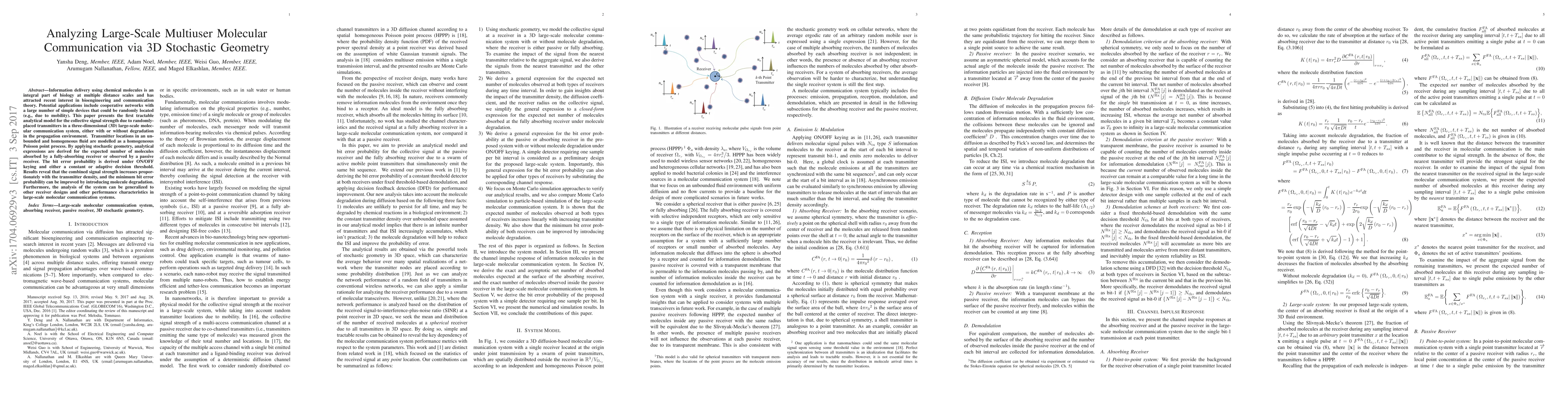 This paper develops a tractable analytical model for large-scale multiuser molecular communication using 3D stochastic geometry, showing that signal strength scales with transmitter density. It also demonstrates that molecule degradation can improve minimum bit error probability, providing a foundation for further system analyses.