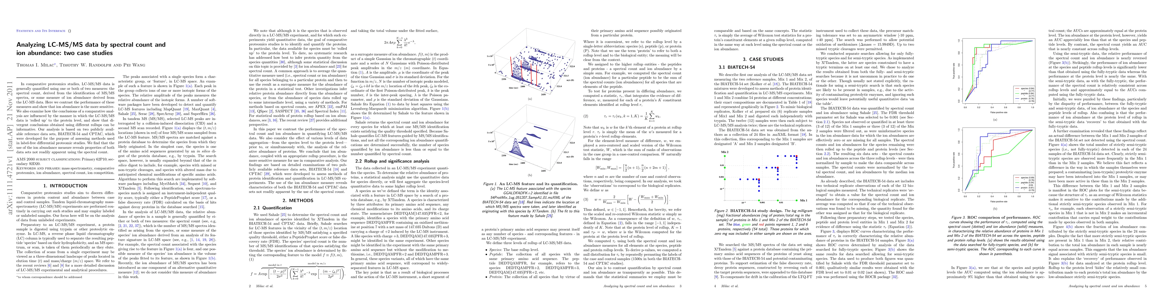 This paper contrasts the performance of spectral count and ion abundance measures in LC-MS/MS data analysis, demonstrating that ion abundance is more sensitive. It also explores how different methods of aggregating data to the protein level can lead to divergent conclusions, using two reference datasets.