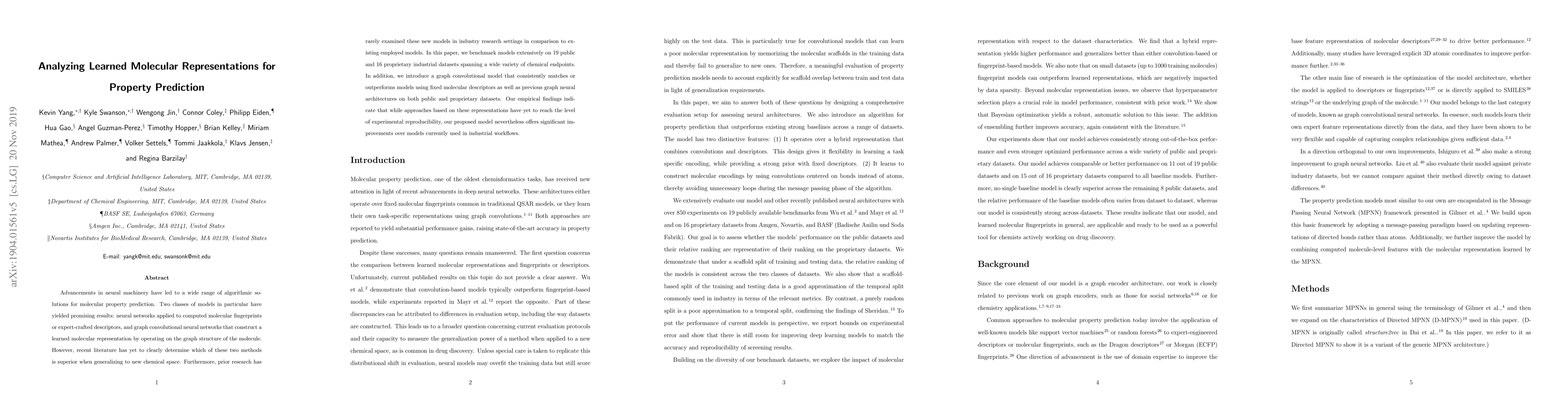Advancements in neural machinery have led to a wide range of algorithmic solutions for molecular property prediction. Two classes of models in particular have yielded promising results: neural networks applied to computed molecular fingerprints or expert-crafted descriptors, and graph convolutional neural networks that construct a learned molecular representation by operating on the graph structure of the molecule. However, recent literature has yet to clearly determine which of these two methods is superior when generalizing to new chemical space. Furthermore, prior research has rarely examined these new models in industry research settings in comparison to existing employed models. In this paper, we benchmark models extensively on 19 public and 16 proprietary industrial datasets spanning a wide variety of chemical endpoints. In addition, we introduce a graph convolutional model that consistently matches or outperforms models using fixed molecular descriptors as well as previous graph neural architectures on both public and proprietary datasets. Our empirical findings indicate that while approaches based on these representations have yet to reach the level of experimental reproducibility, our proposed model nevertheless offers significant improvements over models currently used in industrial workflows.