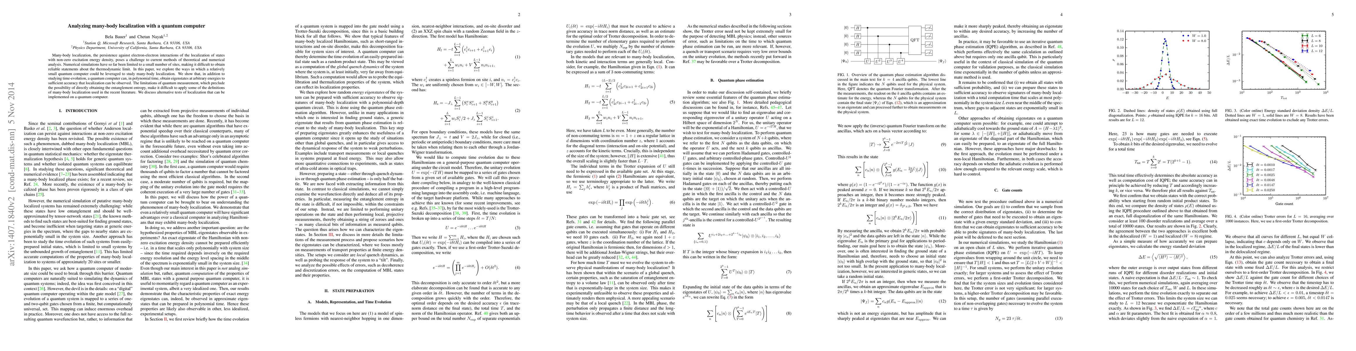 This paper investigates the potential of a small quantum computer to study many-body localization, demonstrating that it can obtain eigenstates at arbitrary energies to observe localization effects. It also discusses alternative localization tests due to the limitations of quantum measurement in directly obtaining entanglement entropy.