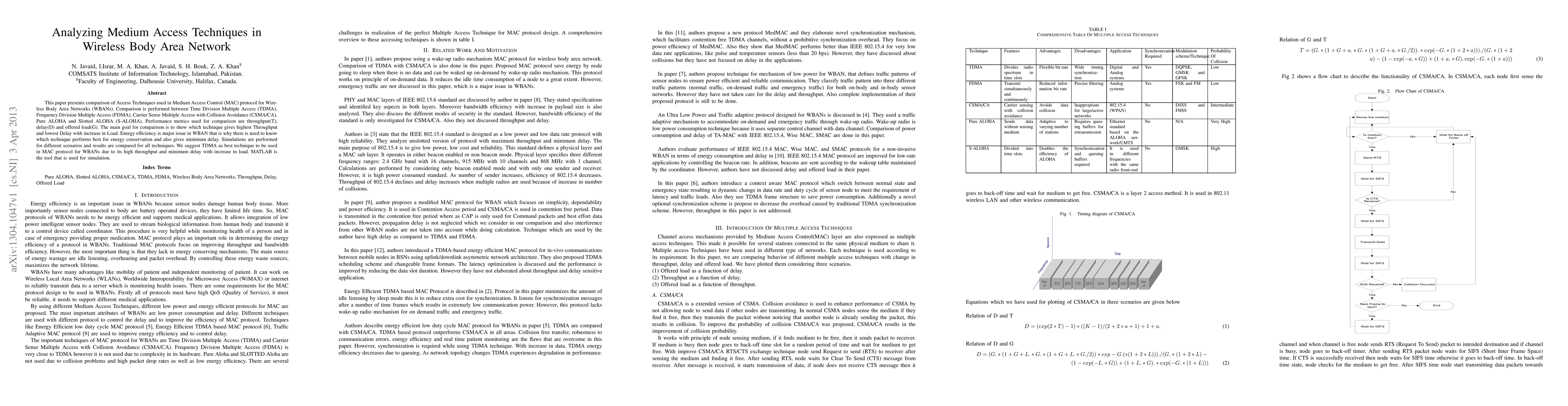 This paper compares various Medium Access Techniques in Wireless Body Area Networks (WBANs), focusing on TDMA, FDMA, CSMA/CA, Pure ALOHA, and Slotted ALOHA. The study evaluates performance metrics including Throughput, Delay, and Offered Load, concluding that TDMA offers the best balance of high throughput, minimal delay, and energy efficiency, as demonstrated through MATLAB simulations.