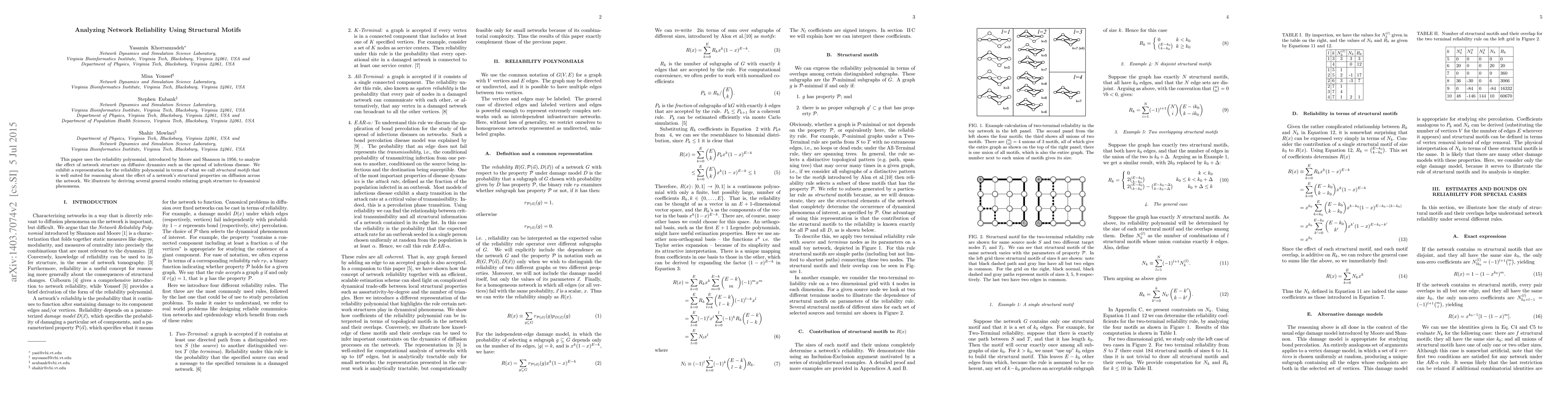 This paper analyzes network reliability using structural motifs to understand the spread of infectious diseases, leveraging the reliability polynomial and representing it in terms of structural motifs for better insights into network dynamics. General results are derived to link graph structure with diffusion phenomena.