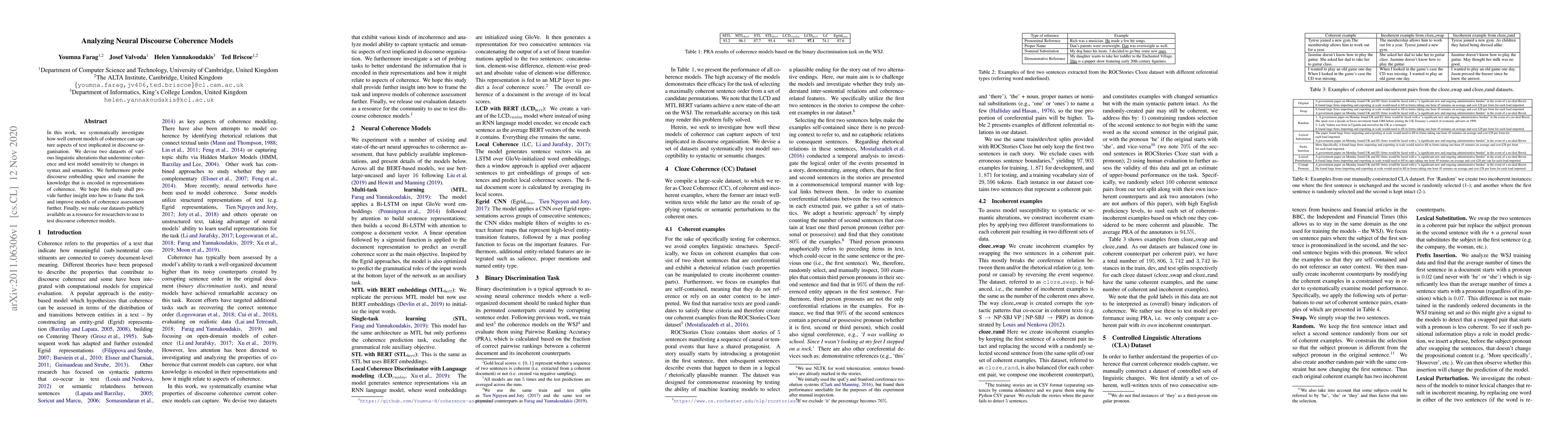 This research investigates the effectiveness of current neural models in assessing discourse coherence by creating datasets that test their sensitivity to syntactic and semantic changes. The study also explores the knowledge embedded in coherence representations and aims to improve coherence assessment models, releasing the datasets for further research.
