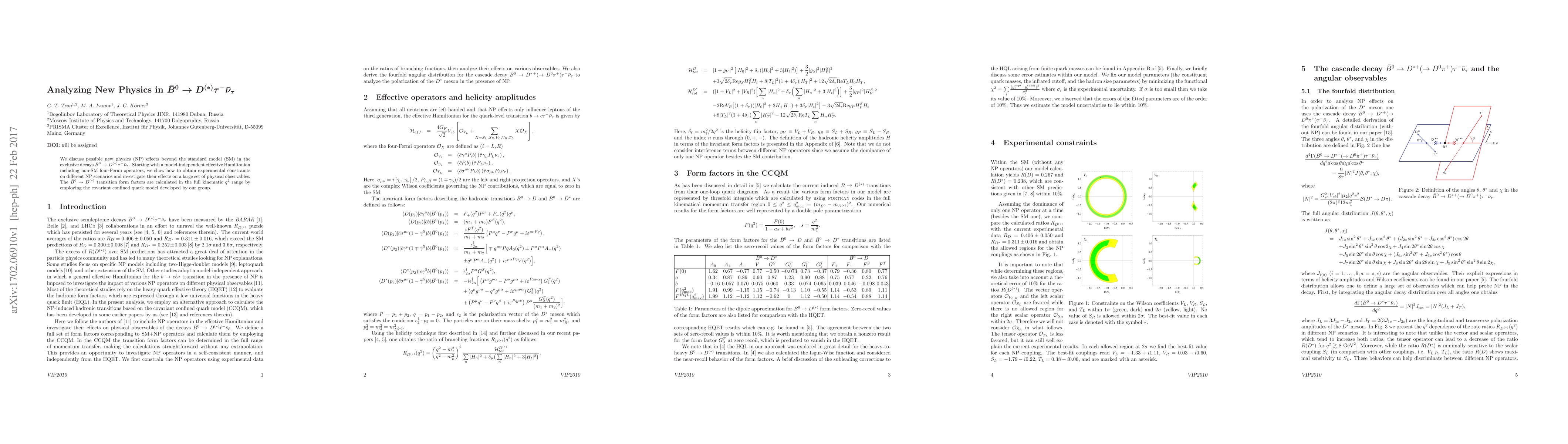 We discuss possible new physics (NP) effects beyond the standard model (SM) in the exclusive decays $\bar{B}^0 \to D^{(\ast)} \tau^- \bar{\nu}_{\tau}$. Starting with a model-independent effective Hamiltonian including non-SM four-Fermi operators, we show how to obtain experimental constraints on different NP scenarios and investigate their effects on a large set of physical observables. The $\bar{B}^0 \to D^{(\ast)}$ transition form factors are calculated in the full kinematic $q^2$ range by employing the covariant confined quark model developed by our group.