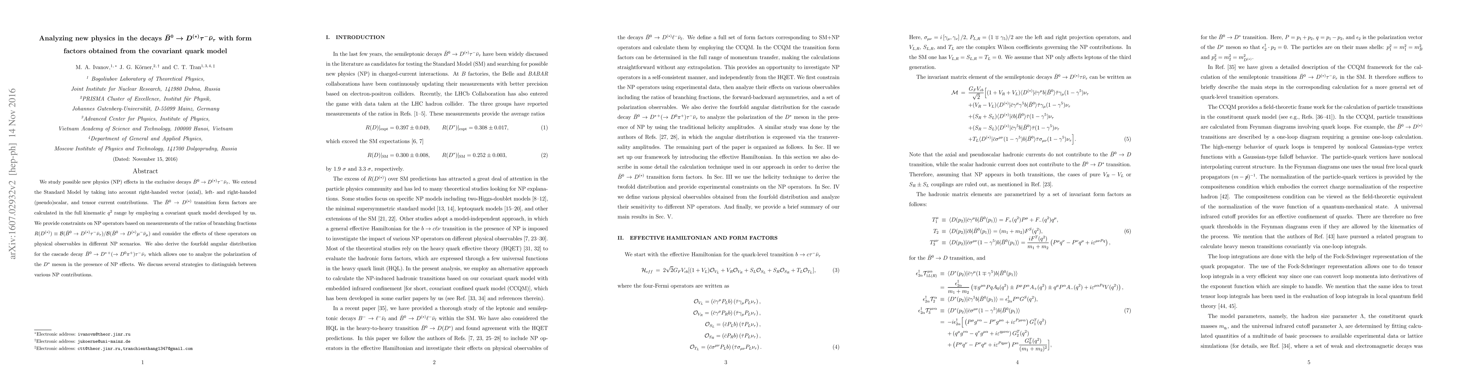 This paper explores potential New Physics effects in the decay $\bar{B}^0 \to D^{(\ast)} \tau^- \bar{\nu}_{\tau}$ by extending the Standard Model with various NP operators. The study uses a covariant quark model to calculate form factors and provides constraints on these operators based on branching fraction ratios and angular distributions.