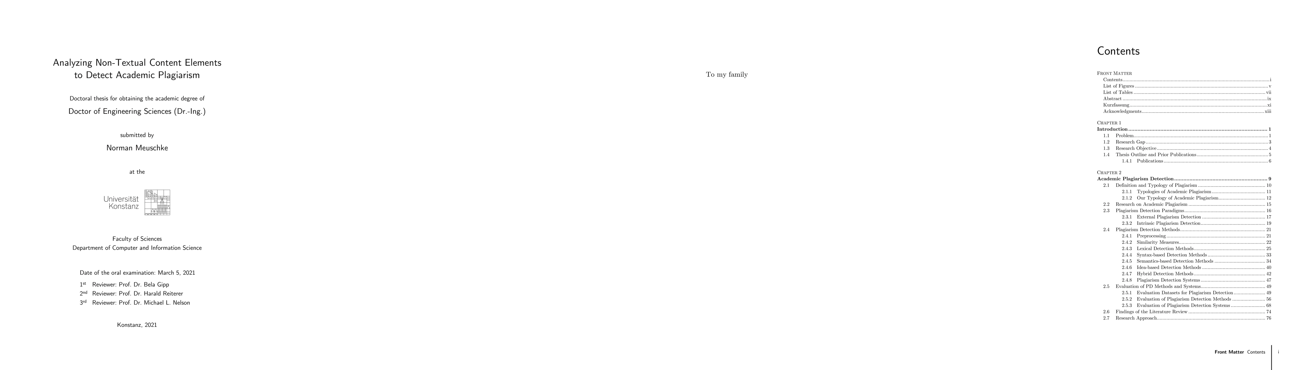 This paper proposes novel plagiarism detection methods that analyze non-textual content such as citations, images, and mathematical content to complement traditional text-based approaches. Evaluations show that non-textual elements provide significant, language-independent clues that enhance detection of disguised plagiarism, leading to the development of a comprehensive plagiarism detection system.