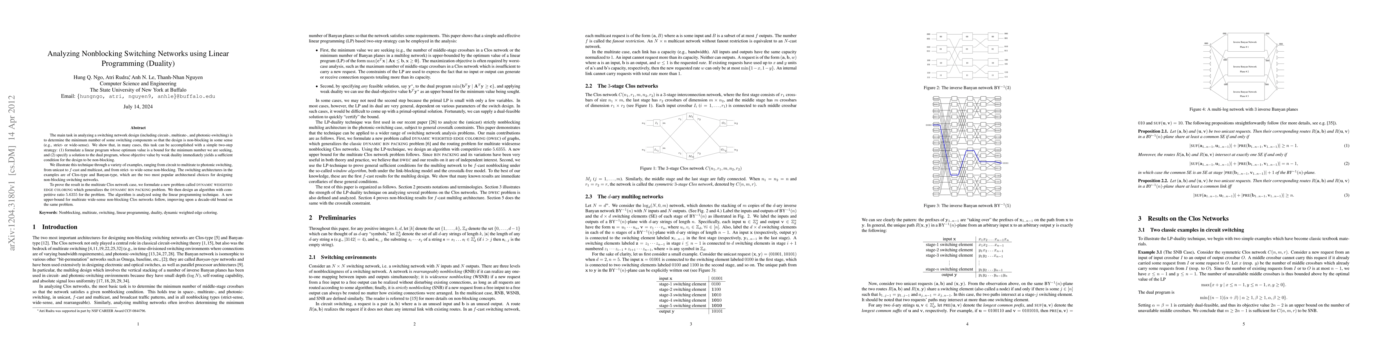 The main task in analyzing a switching network design (including circuit-, multirate-, and photonic-switching) is to determine the minimum number of some switching components so that the design is non-blocking in some sense (e.g., strict- or wide-sense). We show that, in many cases, this task can be accomplished with a simple two-step strategy: (1) formulate a linear program whose optimum value is a bound for the minimum number we are seeking, and (2) specify a solution to the dual program, whose objective value by weak duality immediately yields a sufficient condition for the design to be non-blocking. We illustrate this technique through a variety of examples, ranging from circuit to multirate to photonic switching, from unicast to $f$-cast and multicast, and from strict- to wide-sense non-blocking. The switching architectures in the examples are of Clos-type and Banyan-type, which are the two most popular architectural choices for designing non-blocking switching networks. To prove the result in the multirate Clos network case, we formulate a new problem called {\sc dynamic weighted edge coloring} which generalizes the {\sc dynamic bin packing} problem. We then design an algorithm with competitive ratio 5.6355 for the problem. The algorithm is analyzed using the linear programming technique. A new upper-bound for multirate wide-sense non-blocking Clos networks follow, improving upon a decade-old bound on the same problem.