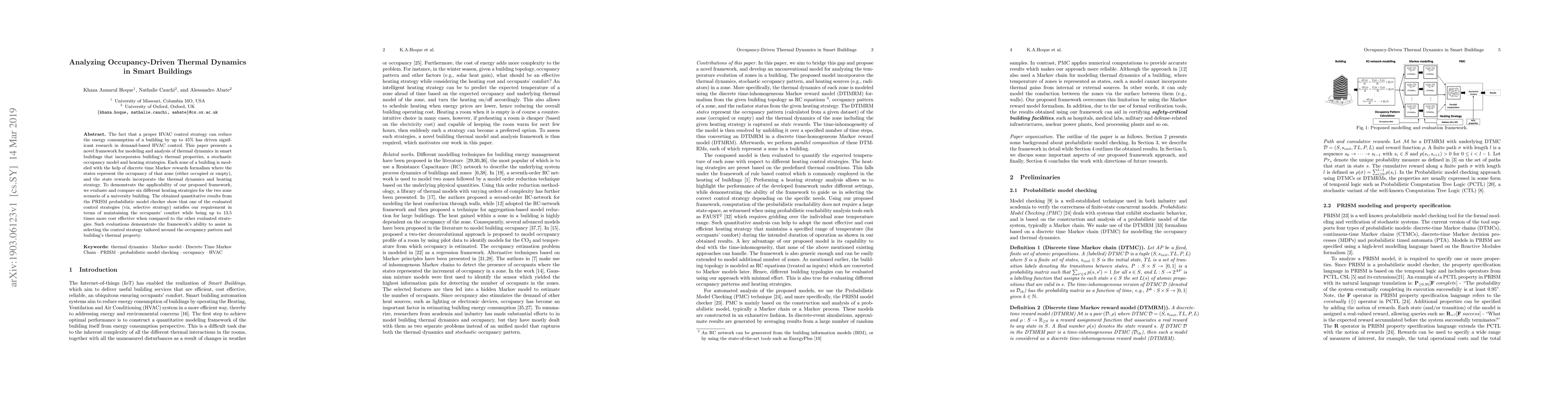The fact that a proper HVAC control strategy can reduce the energy consumption of a building by up to 45% has driven significant research in demand-based HVAC control. This paper presents a novel framework for modeling and analysis of thermal dynamics in smart buildings that incorporates building's thermal properties, a stochastic occupancy model and heating strategies. Each zone of a building is modeled with the help of discrete time Markov rewards formalism where the states represent the occupancy of that zone (either occupied or empty), and the state rewards incorporate the thermal dynamics and heating strategy. To demonstrate the applicability of our proposed framework, we evaluate and compare six different heating strategies for the two zone scenario of a university building. The obtained quantitative results from the PRISM probabilistic model checker show that one of the evaluated control strategies (viz. selective strategy) satisfies our requirement in terms of maintaining the occupants' comfort while being up to 13.5 times more cost effective when compared to the other evaluated strategies. Such evaluations demonstrate the framework's ability to assist in selecting the control strategy tailored around the occupancy pattern and building's thermal property.