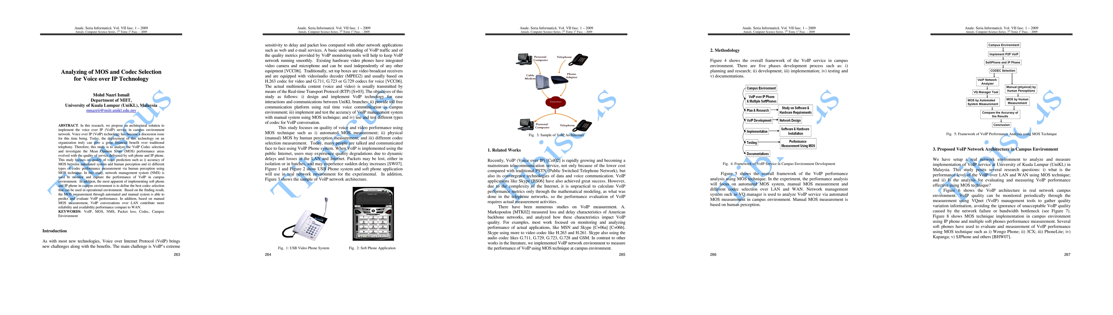 In this research, we propose an architectural solution to implement the voice over IP (VoIP) service in campus environment network. Voice over IP (VoIP) technology has become a discussion issue for this time being. Today, the deployment of this technology on an organization truly can give a great financial benefit over traditional telephony. Therefore, this study is to analyze the VoIP Codec selection and investigate the Mean Opinion Score (MOS) performance areas evolved with the quality of service delivered by soft phone and IP phone. This study focuses on quality of voice prediction such as i) accuracy of MOS between automated system and human perception and ii) different types of codec performance measurement via human perception using MOS technique. In this study, network management system (NMS) is used to monitor and capture the performance of VoIP in campus environment. In addition, the most apparent of implementing soft phone and IP phone in campus environment is to define the best codec selection that can be used in operational environment. Based on the finding result, the MOS measurement through automated and manual system is able to predict and evaluate VoIP performance. In addition, based on manual MOS measurement, VoIP conversations over LAN contribute more reliability and availability performance compare to WAN.