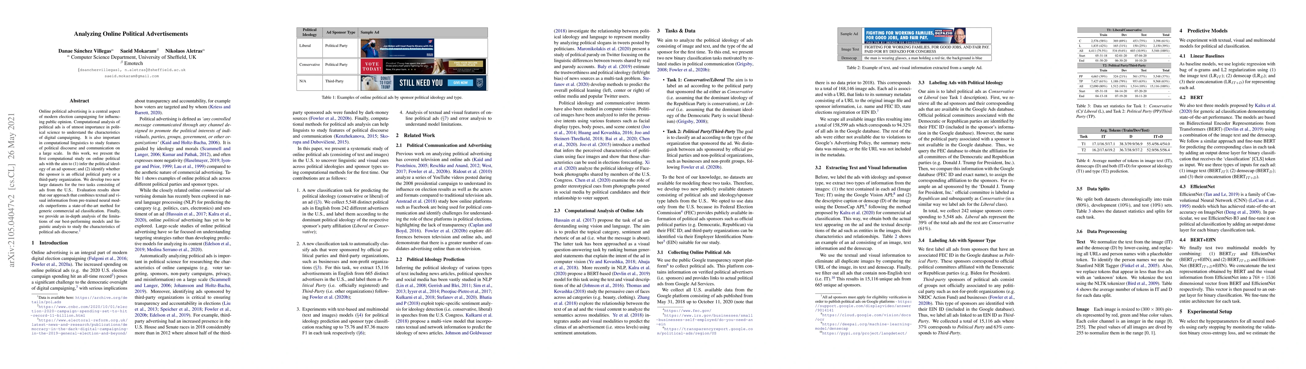 This study analyzes online political advertisements to infer ad sponsors' political ideologies and determine if they are political parties or third-party organizations. It introduces new datasets and shows that a combined textual and visual neural model approach outperforms existing commercial ad classification methods.