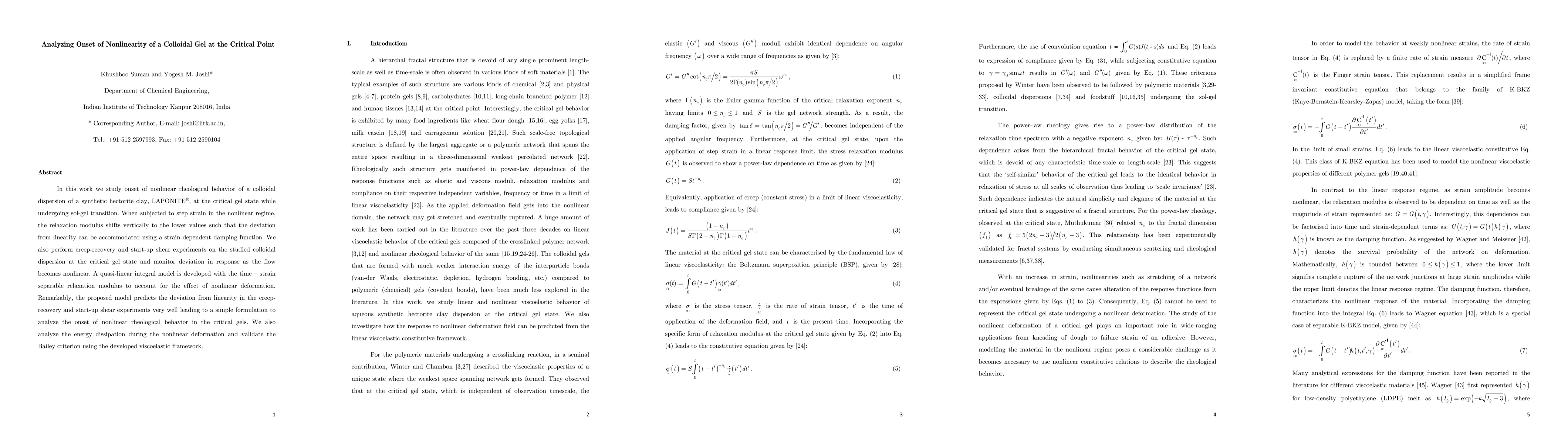 This paper investigates the nonlinear rheological behavior of a colloidal gel of synthetic hectorite clay (Laponite) at its critical gel state. The study develops a quasi-linear integral model to predict the onset of nonlinearity during creep-recovery and start-up shear experiments, successfully validating the Bailey criterion for energy dissipation.