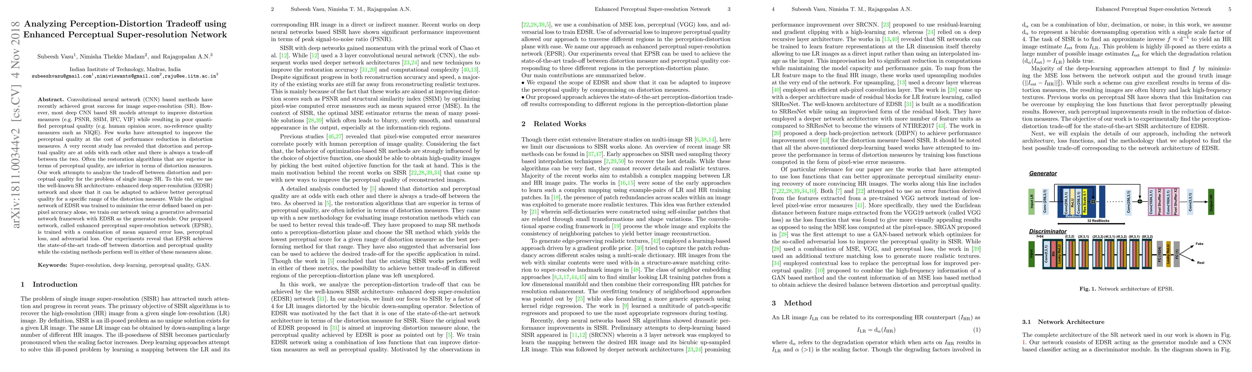 This paper analyzes the tradeoff between distortion and perceptual quality in single image super-resolution (SR) using an enhanced perceptual super-resolution network (EPSR). The EPSR network, based on the EDSR architecture, is trained with a combination of mean squared error, perceptual loss, and adversarial loss, achieving state-of-the-art performance in balancing both distortion and perceptual quality.