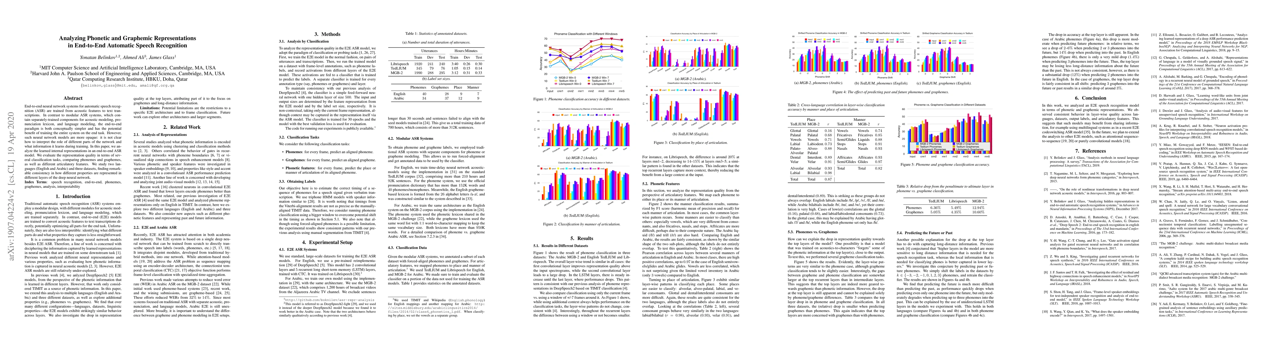 This paper analyzes internal representations in an end-to-end automatic speech recognition model, evaluating how phonemes and graphemes are represented across different layers of the network. The study reveals consistent patterns in representation quality across English and Arabic languages and various datasets.