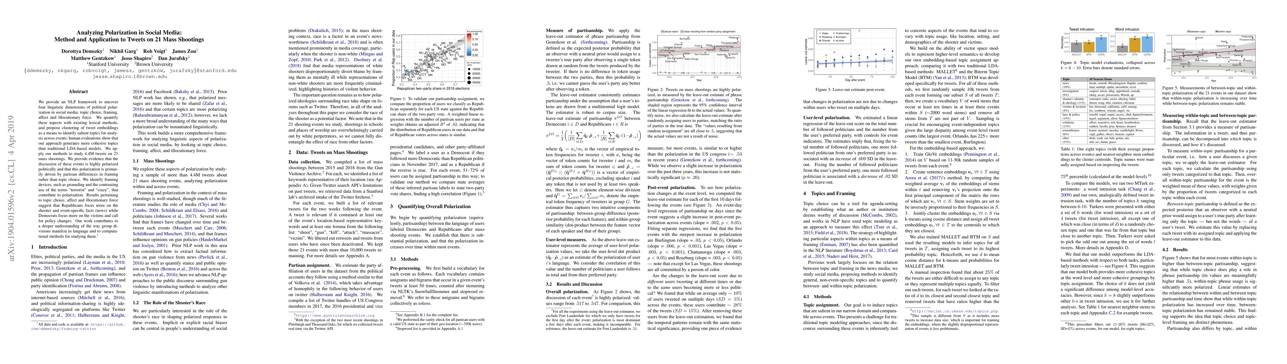 This research introduces a Natural Language Processing (NLP) framework to analyze political polarization on social media, specifically focusing on tweets about 21 mass shootings. The study reveals that polarization is mainly driven by differing framing (use of terms like 'terrorist' vs. 'crazy') rather than chosen topics. It also indicates partisan differences in emphasis, with Republicans focusing on shooters and event facts, and Democrats on victims and policy changes.