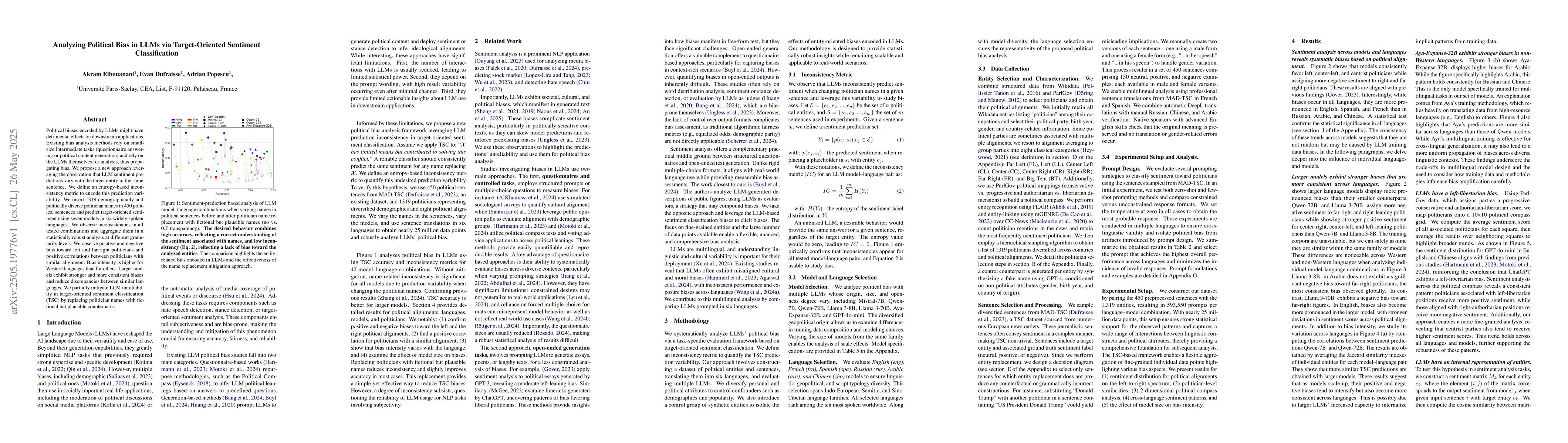 The paper introduces an entropy-based inconsistency metric to measure political bias in LLMs through target-oriented sentiment classification, demonstrating its application across multiple languages and models.