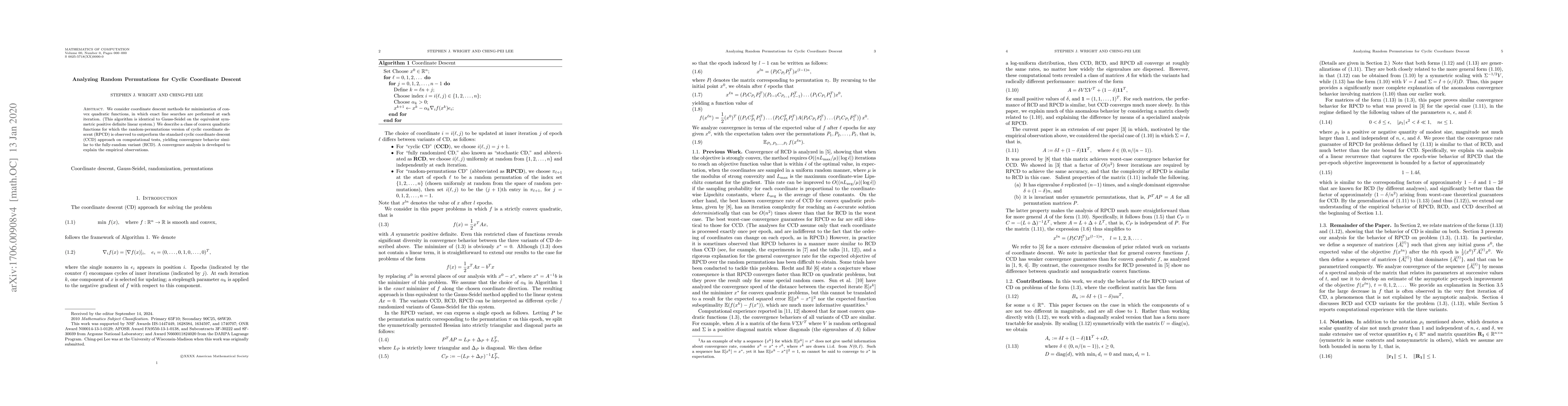 This paper explores how random permutations in cyclic coordinate descent (RPCD) outperform standard cyclic coordinate descent (CCD) for certain convex quadratic problems, achieving convergence akin to fully-random coordinate descent (RCD), supported by a developed convergence analysis.