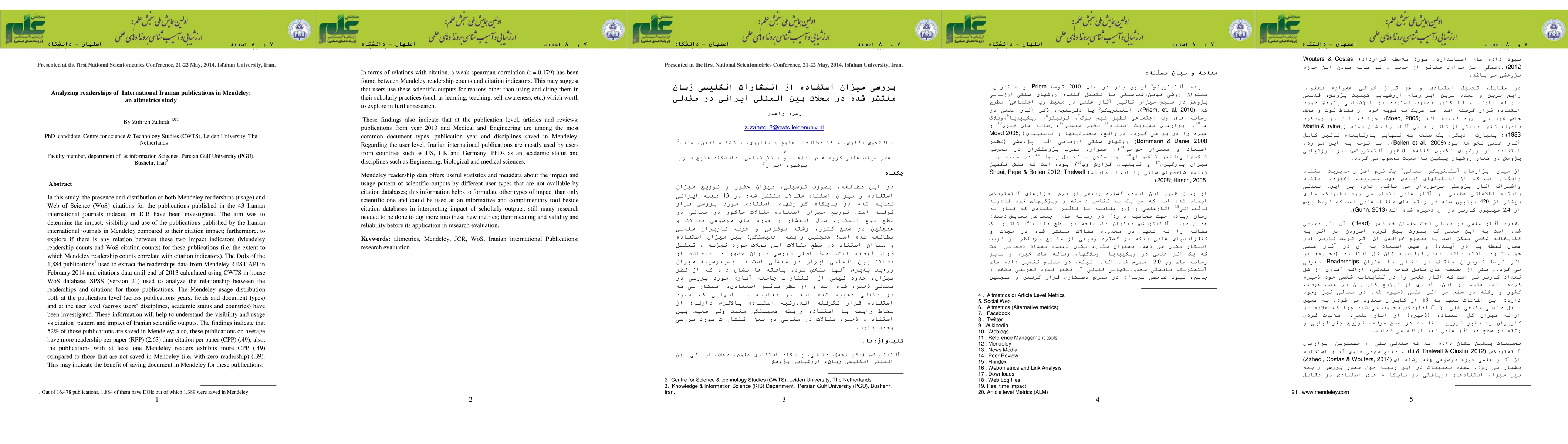 This study analyzes the readerships and Web of Science citations of 43 Iranian international journals indexed in Journal Citation Reports, using Mendeley data and WoS citation counts. The research aims to compare the visibility and usage of Iranian publications in Mendeley against their citation impact, and to explore any relationship between Mendeley readerships and WoS citations.