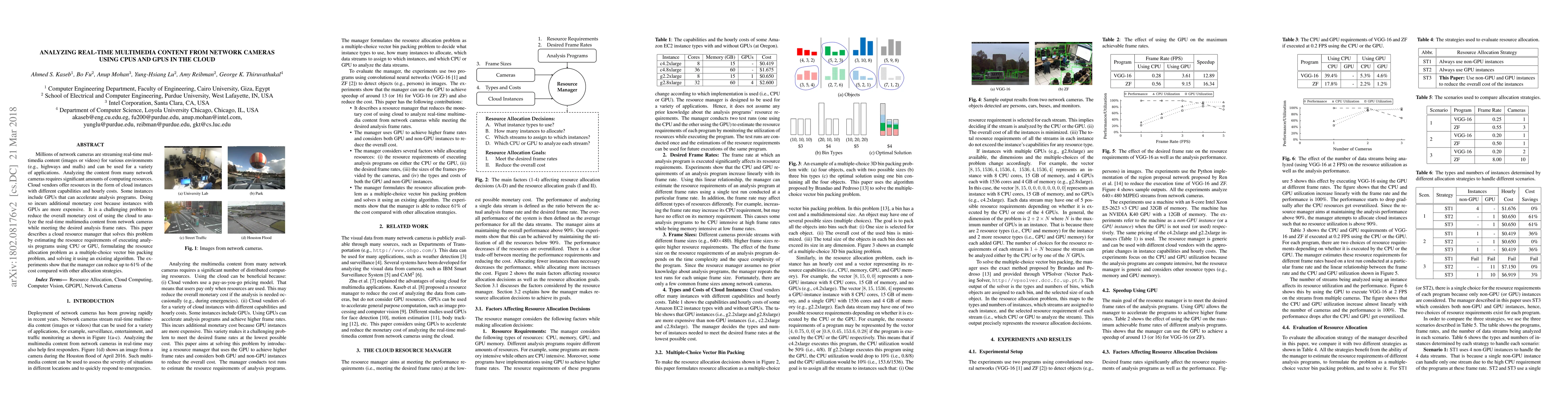 Millions of network cameras are streaming real-time multimedia content (images or videos) for various environments (e.g., highways and malls) and can be used for a variety of applications. Analyzing the content from many network cameras requires significant amounts of computing resources. Cloud vendors offer resources in the form of cloud instances with different capabilities and hourly costs. Some instances include GPUs that can accelerate analysis programs. Doing so incurs additional monetary cost because instances with GPUs are more expensive. It is a challenging problem to reduce the overall monetary cost of using the cloud to analyze the real-time multimedia content from network cameras while meeting the desired analysis frame rates. This paper describes a cloud resource manager that solves this problem by estimating the resource requirements of executing analysis programs using CPU or GPU, formulating the resource allocation problem as a multiple-choice vector bin packing problem, and solving it using an existing algorithm. The experiments show that the manager can reduce up to 61\% of the cost compared with other allocation strategies.