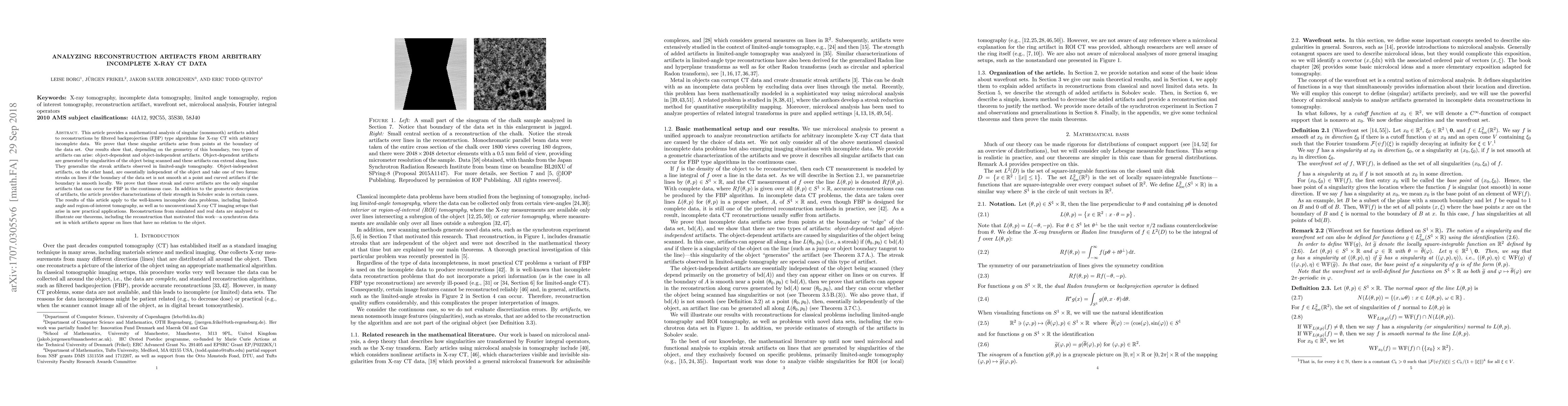 This paper mathematically analyzes singular artifacts in X-ray CT reconstructions from incomplete data using filtered backprojection, identifying two types: object-dependent and object-independent. The study proves that these artifacts arise from the data set boundary geometry and characterizes their strength in Sobolev scale.