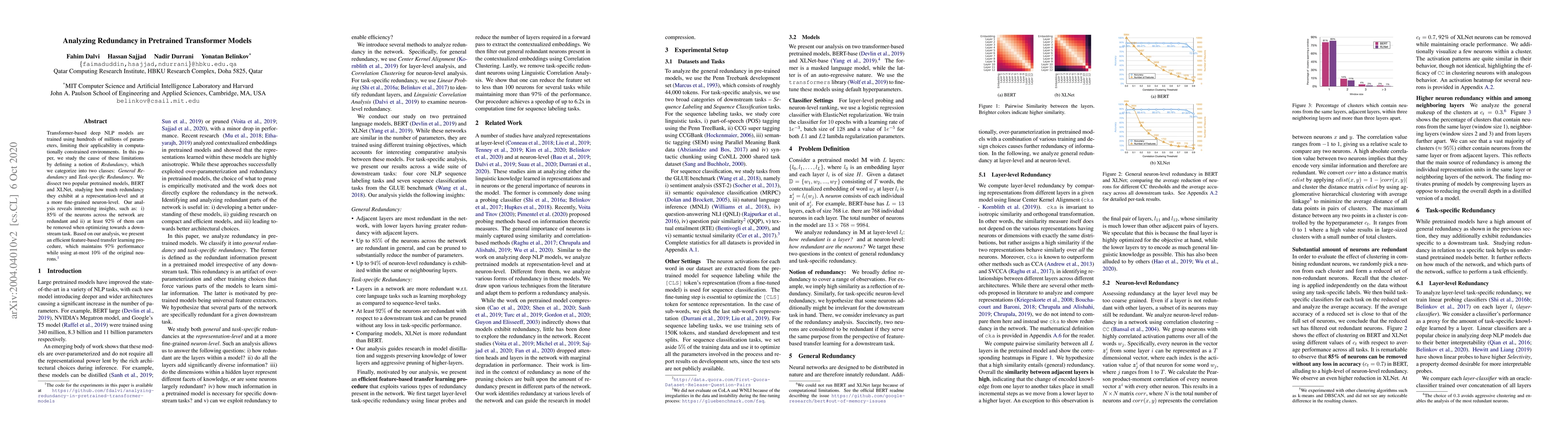 Transformer-based deep NLP models are trained using hundreds of millions of parameters, limiting their applicability in computationally constrained environments. In this paper, we study the cause of these limitations by defining a notion of Redundancy, which we categorize into two classes: General Redundancy and Task-specific Redundancy. We dissect two popular pretrained models, BERT and XLNet, studying how much redundancy they exhibit at a representation-level and at a more fine-grained neuron-level. Our analysis reveals interesting insights, such as: i) 85% of the neurons across the network are redundant and ii) at least 92% of them can be removed when optimizing towards a downstream task. Based on our analysis, we present an efficient feature-based transfer learning procedure, which maintains 97% performance while using at-most 10% of the original neurons.