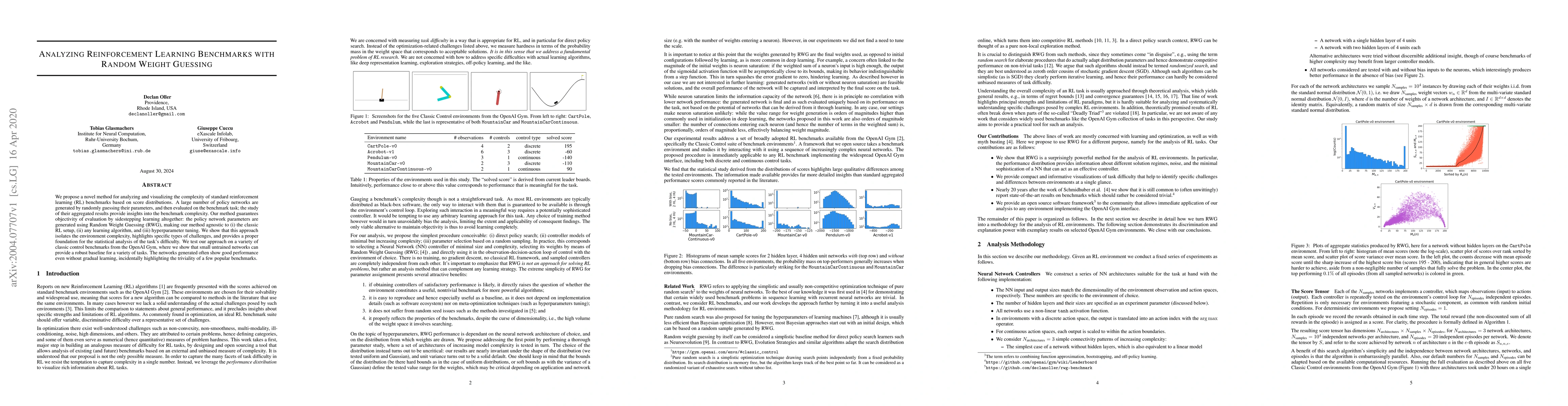 Researchers proposed a method to analyze reinforcement learning benchmarks by generating policy networks with random weights, providing insights into benchmark complexity without relying on learning algorithms or hyperparameter tuning. The approach revealed the triviality of some popular benchmarks and offered a robust baseline for various tasks using small untrained networks.