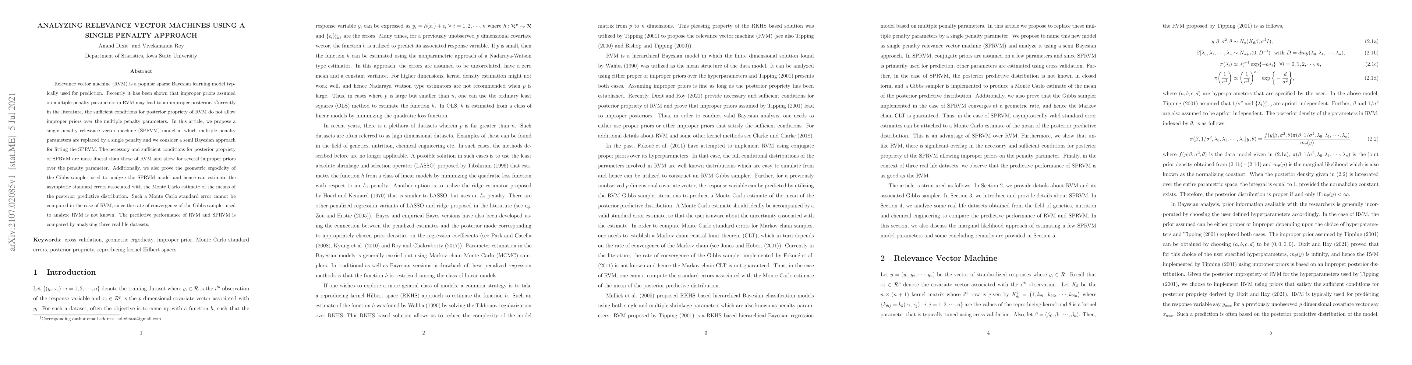 Researchers proposed a new model called Single Penalty Relevance Vector Machine (SPRVM) that can handle improper priors and showed it has better conditions for posterior propriety than traditional RVM models. The study also found that SPRVM can estimate asymptotic standard errors of predictive distributions.