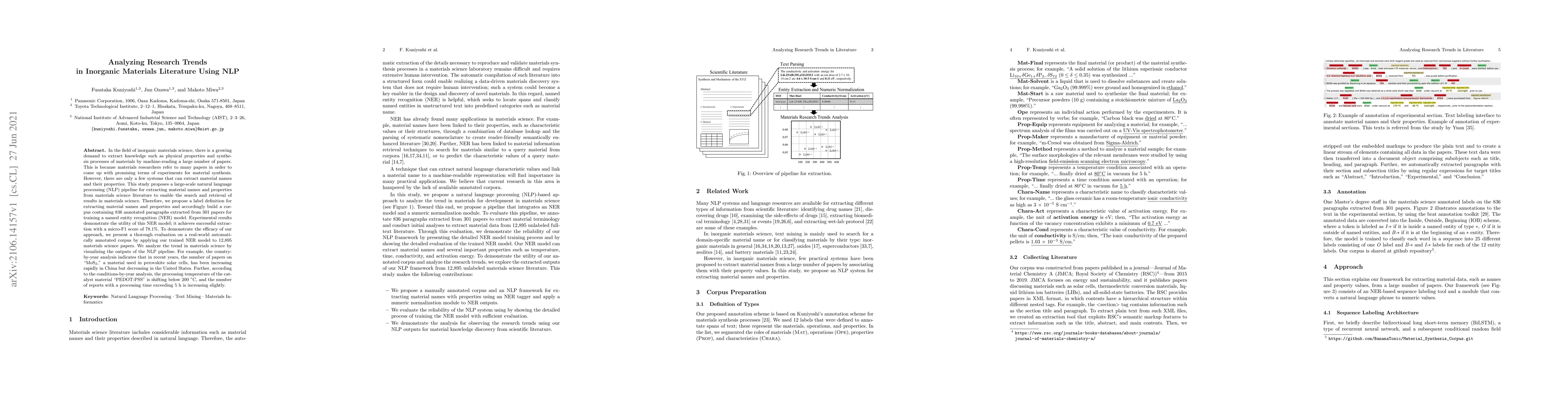 A large-scale NLP pipeline was developed to extract material names and properties from materials science literature, achieving a micro-F1 score of 78.1%. The model revealed trends in materials research, such as increasing interest in certain materials and changing processing conditions over time.