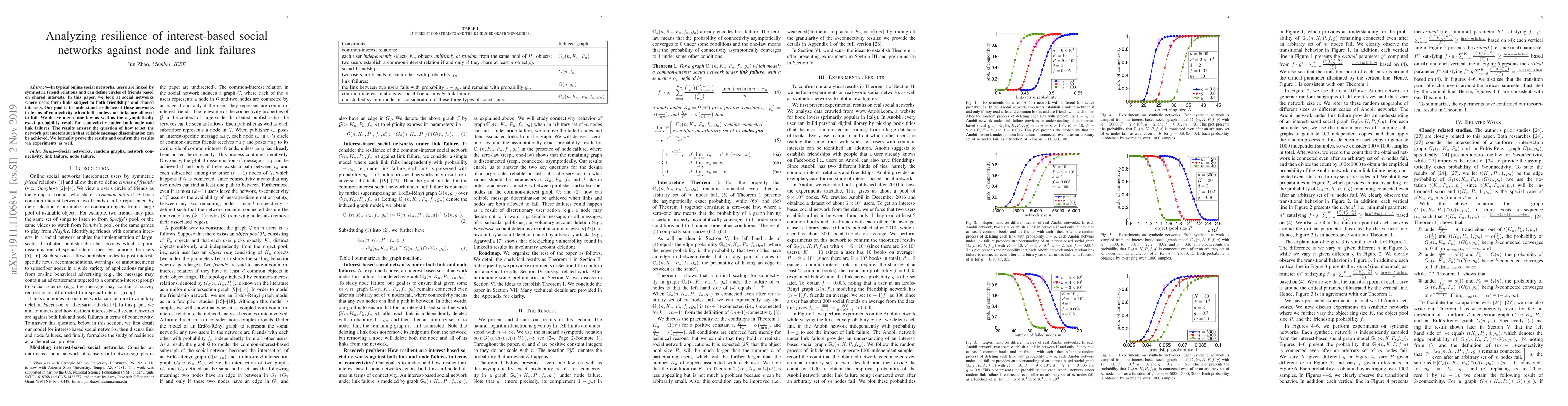 Researchers studied interest-based social networks with node and link failures to determine how to achieve reliable message dissemination. They derived a zero-one law and calculated the probability of connectivity under both types of failures.