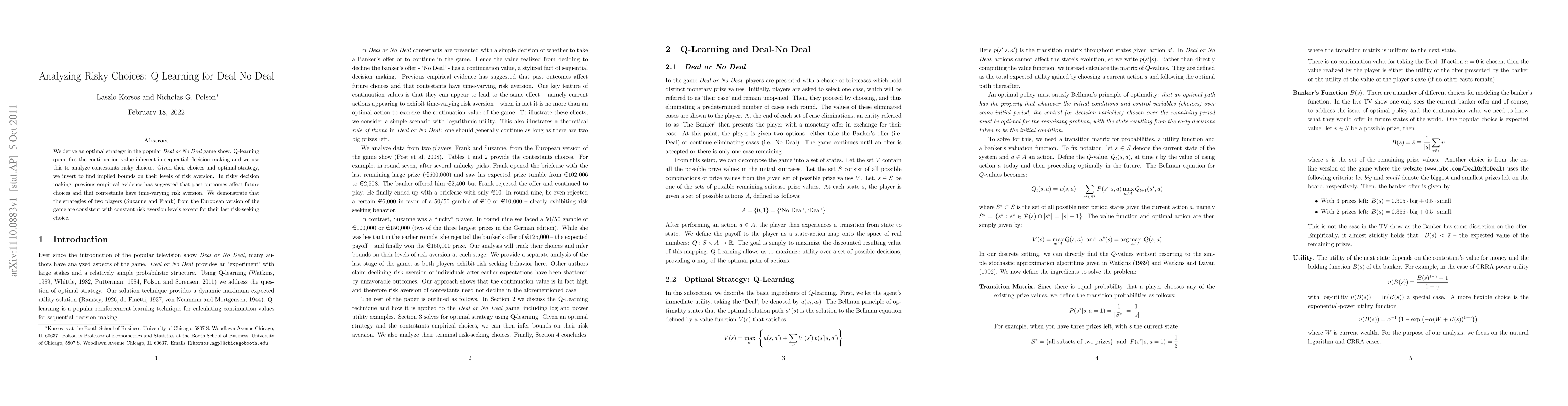 We derive an optimal strategy in the popular Deal or No Deal game show. Q-learning quantifies the continuation value inherent in sequential decision making and we use this to analyze contestants risky choices. Given their choices and optimal strategy, we invert to find implied bounds on their levels of risk aversion. In risky decision making, previous empirical evidence has suggested that past outcomes affect future choices and that contestants have time-varying risk aversion. We demonstrate that the strategies of two players (Suzanne and Frank) from the European version of the game are consistent with constant risk aversion levels except for their last risk-seeking choice.