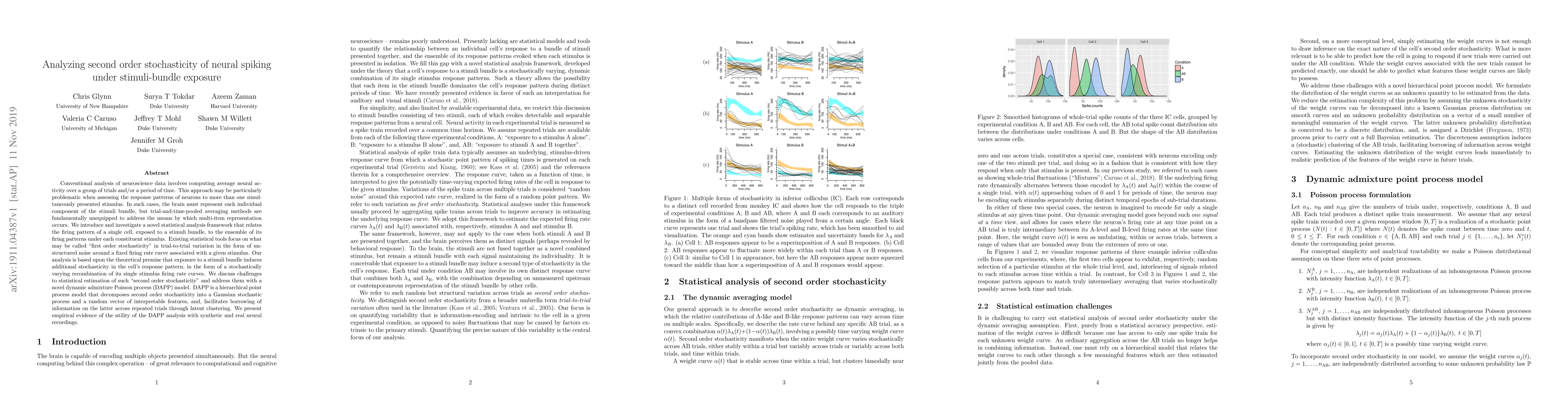Conventional analysis of neuroscience data involves computing average neural activity over a group of trials and/or a period of time. This approach may be particularly problematic when assessing the response patterns of neurons to more than one simultaneously presented stimulus. In such cases, the brain must represent each individual component of the stimuli bundle, but trial-and-time-pooled averaging methods are fundamentally unequipped to address the means by which multi-item representation occurs. We introduce and investigate a novel statistical analysis framework that relates the firing pattern of a single cell, exposed to a stimuli bundle, to the ensemble of its firing patterns under each constituent stimulus. Existing statistical tools focus on what may be called "first order stochasticity" in trial-to-trial variation in the form of unstructured noise around a fixed firing rate curve associated with a given stimulus. Our analysis is based upon the theoretical premise that exposure to a stimuli bundle induces additional stochasticity in the cell's response pattern, in the form of a stochastically varying recombination of its single stimulus firing rate curves. We discuss challenges to statistical estimation of such "second order stochasticity" and address them with a novel dynamic admixture Poisson process (DAPP) model. DAPP is a hierarchical point process model that decomposes second order stochasticity into a Gaussian stochastic process and a random vector of interpretable features, and, facilitates borrowing of information on the latter across repeated trials through latent clustering. We present empirical evidence of the utility of the DAPP analysis with synthetic and real neural recordings.