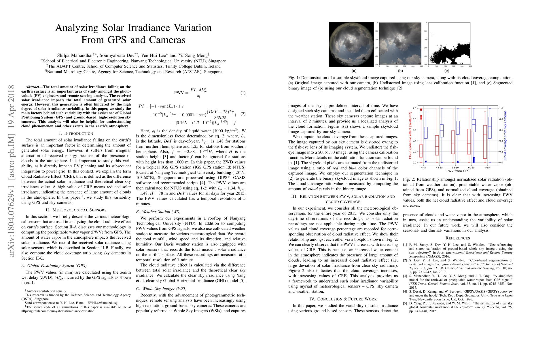 This paper investigates solar irradiance variability using GPS and high-resolution sky cameras, aiming to understand factors affecting solar energy generation and atmospheric events. The study's findings are crucial for improving photovoltaic efficiency and atmospheric analysis.