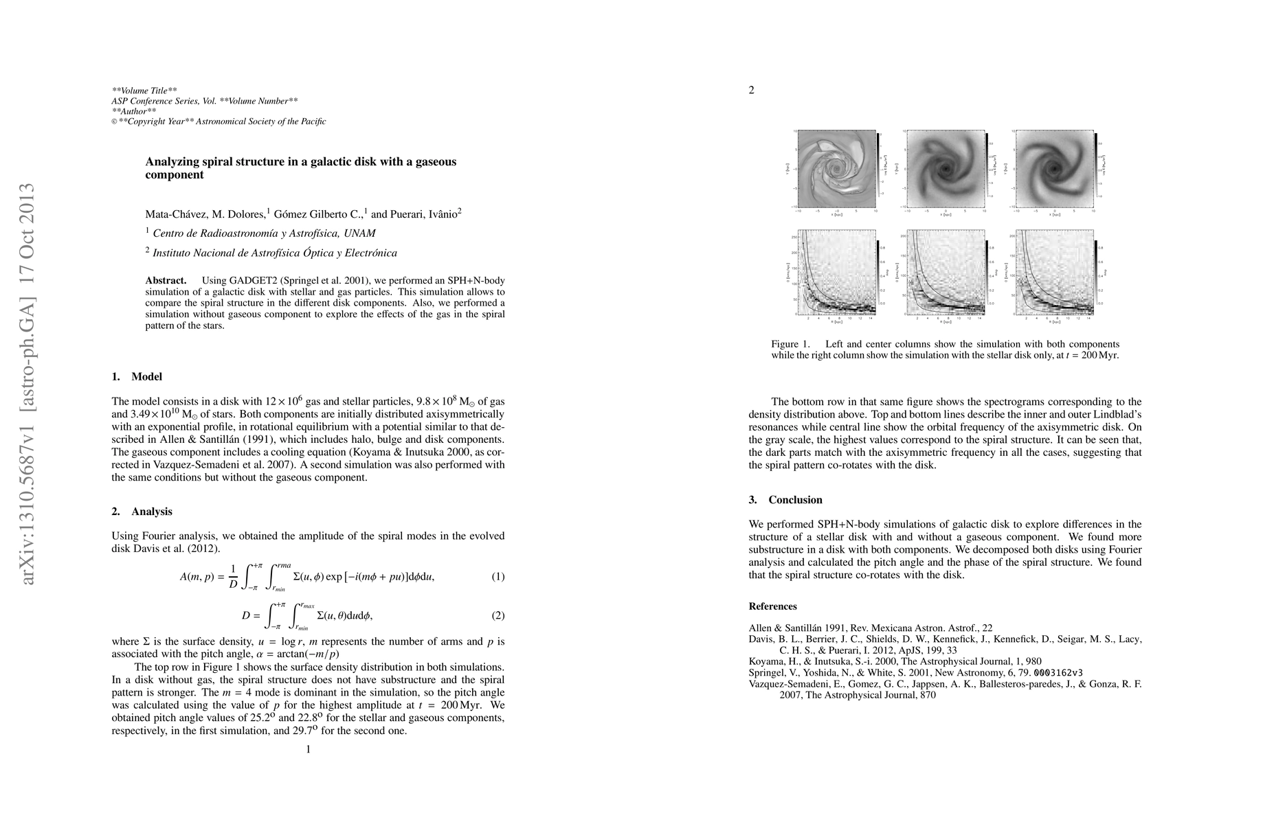 Summary: This study uses GADGET2 to simulate a galactic disk with both stellar and gaseous components, comparing spiral structures in these components. A separate simulation without gas helps to isolate the gas's influence on the spiral patterns of stars.