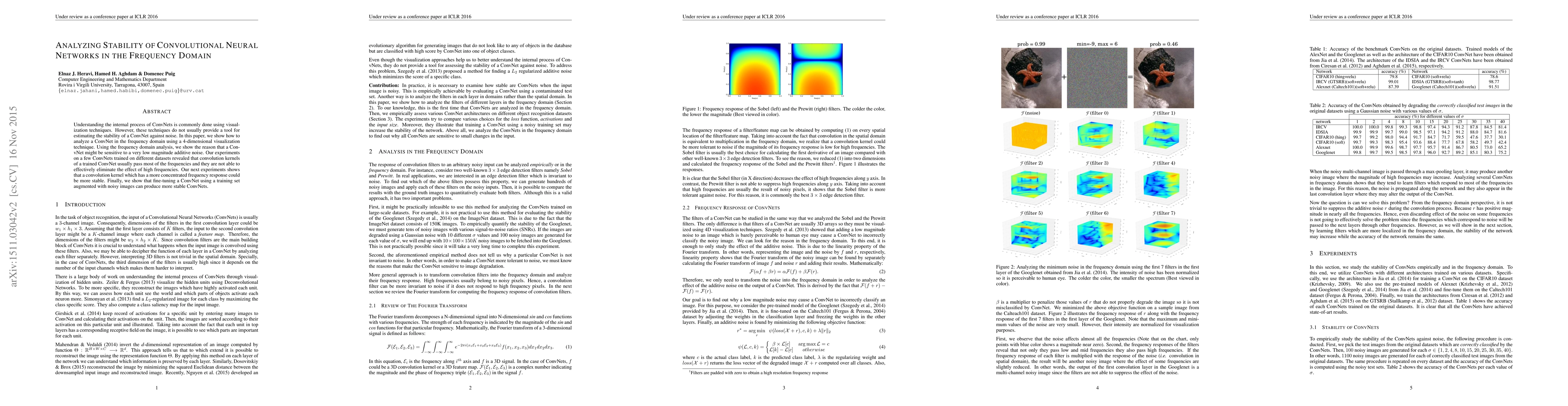 Understanding the internal process of ConvNets is commonly done using visualization techniques. However, these techniques do not usually provide a tool for estimating the stability of a ConvNet against noise. In this paper, we show how to analyze a ConvNet in the frequency domain using a 4-dimensional visualization technique. Using the frequency domain analysis, we show the reason that a ConvNet might be sensitive to a very low magnitude additive noise. Our experiments on a few ConvNets trained on different datasets revealed that convolution kernels of a trained ConvNet usually pass most of the frequencies and they are not able to effectively eliminate the effect of high frequencies. Our next experiments shows that a convolution kernel which has a more concentrated frequency response could be more stable. Finally, we show that fine-tuning a ConvNet using a training set augmented with noisy images can produce more stable ConvNets.