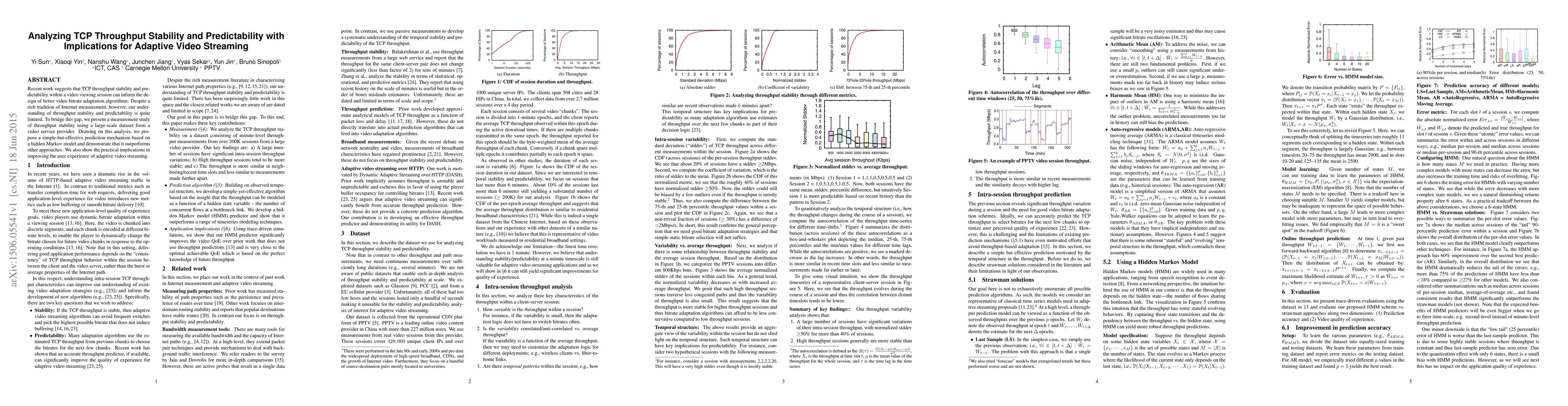 This paper measures TCP throughput stability and predictability using a large dataset from a video service provider, proposing a hidden Markov model-based prediction mechanism that outperforms other methods. The findings suggest improved adaptive video streaming bitrate adaptation can enhance user experience.