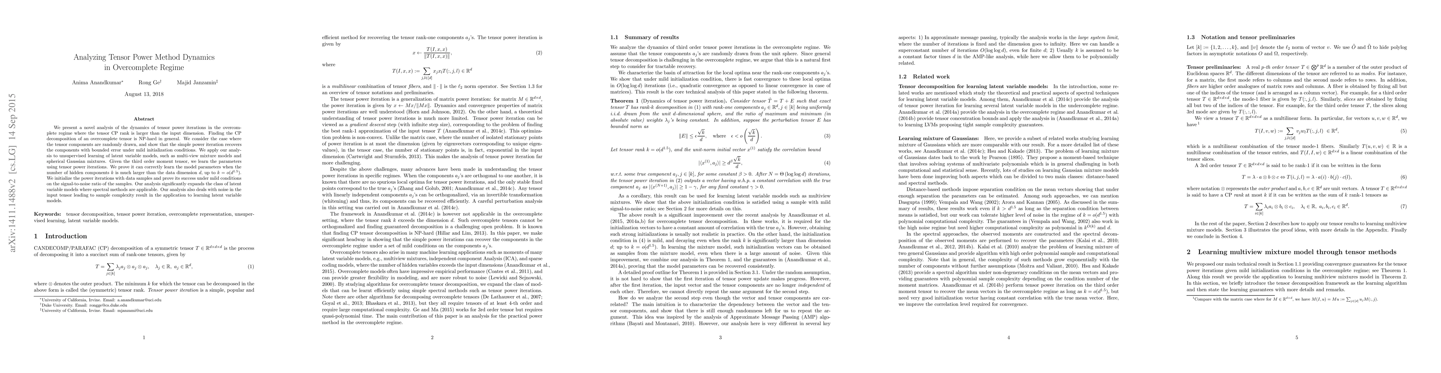 This paper analyzes tensor power iteration dynamics in the overcomplete regime, demonstrating that it can recover tensor components with bounded error under mild initialization conditions. It shows the method's success in learning latent variable models, even when the number of hidden components exceeds the data dimension, and addresses noise in the input tensor.