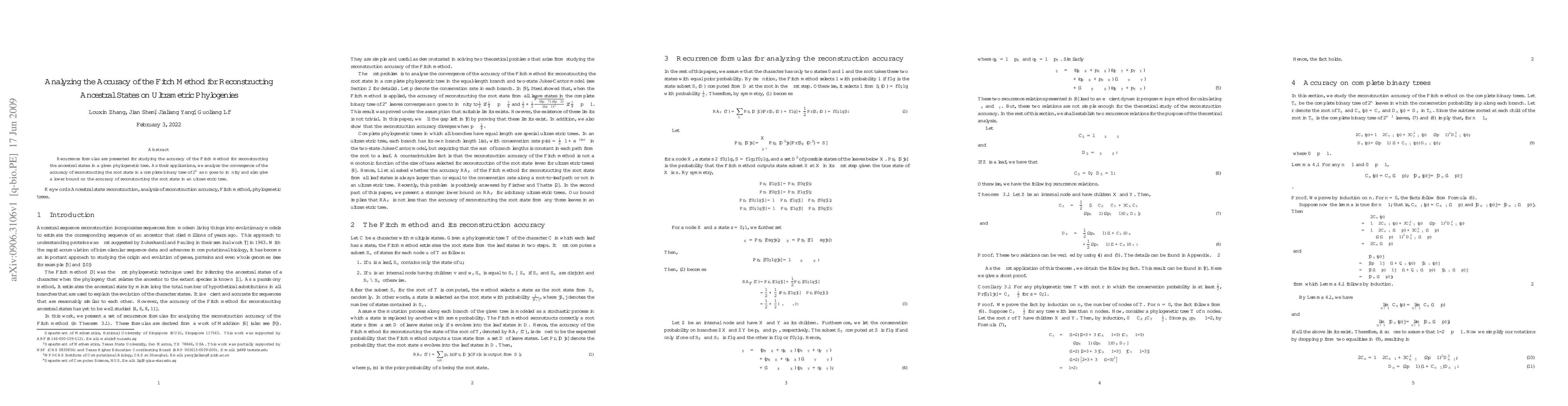 Recurrence formulas are presented for studying the accuracy of the Fitch method for reconstructing the ancestral states in a given phylogenetic tree. As their applications, we analyze the convergence of the accuracy of reconstructing the root state in a complete binary tree of $2^n$ as $n$ goes to infinity and also give a lower bound on the accuracy of reconstructing the root state in an ultrametric tree.