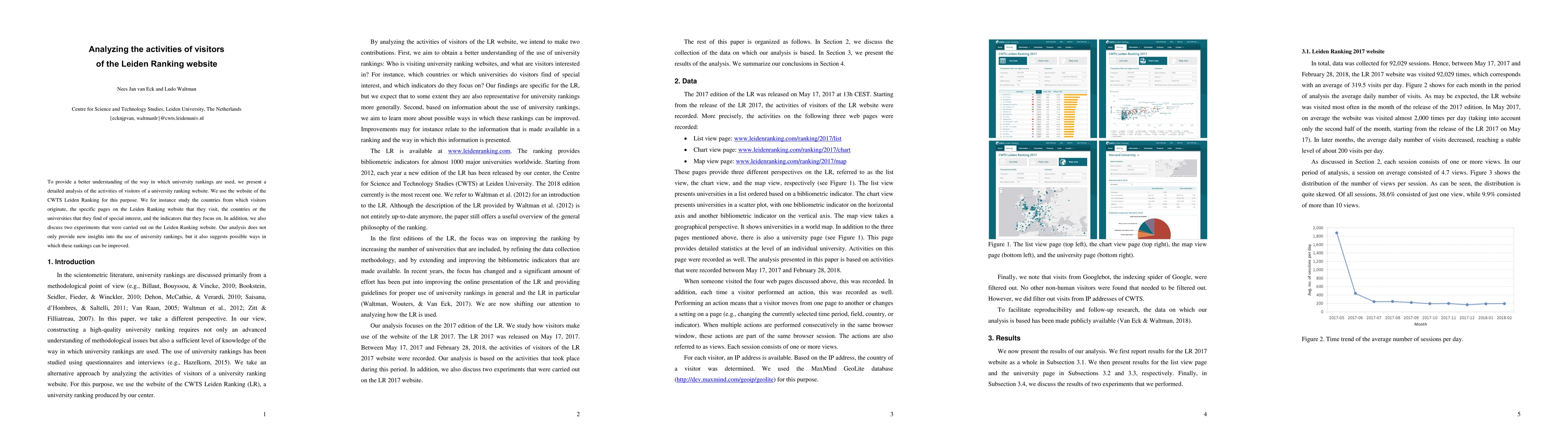 This study analyzes visitor activities on the Leiden Ranking website to understand university ranking usage, examining origins, visited pages, interests, and focus indicators. It also discusses experiments conducted and suggests improvements for the rankings.