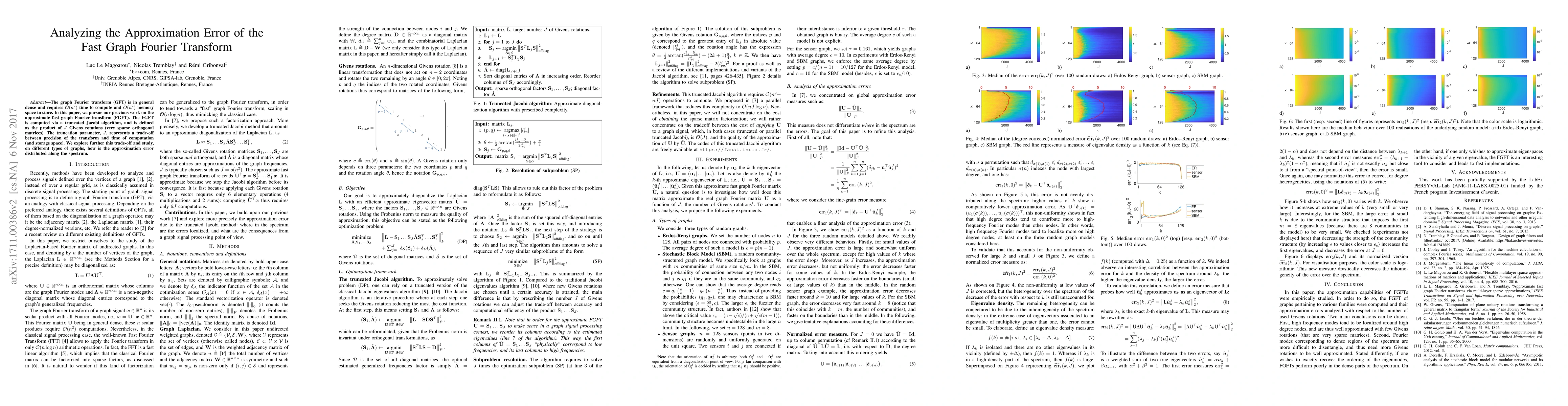 The graph Fourier transform (GFT) is in general dense and requires O(n^2) time to compute and O(n^2) memory space to store. In this paper, we pursue our previous work on the approximate fast graph Fourier transform (FGFT). The FGFT is computed via a truncated Jacobi algorithm, and is defined as the product of J Givens rotations (very sparse orthogonal matrices). The truncation parameter, J, represents a trade-off between precision of the transform and time of computation (and storage space). We explore further this trade-off and study, on different types of graphs, how is the approximation error distributed along the spectrum.