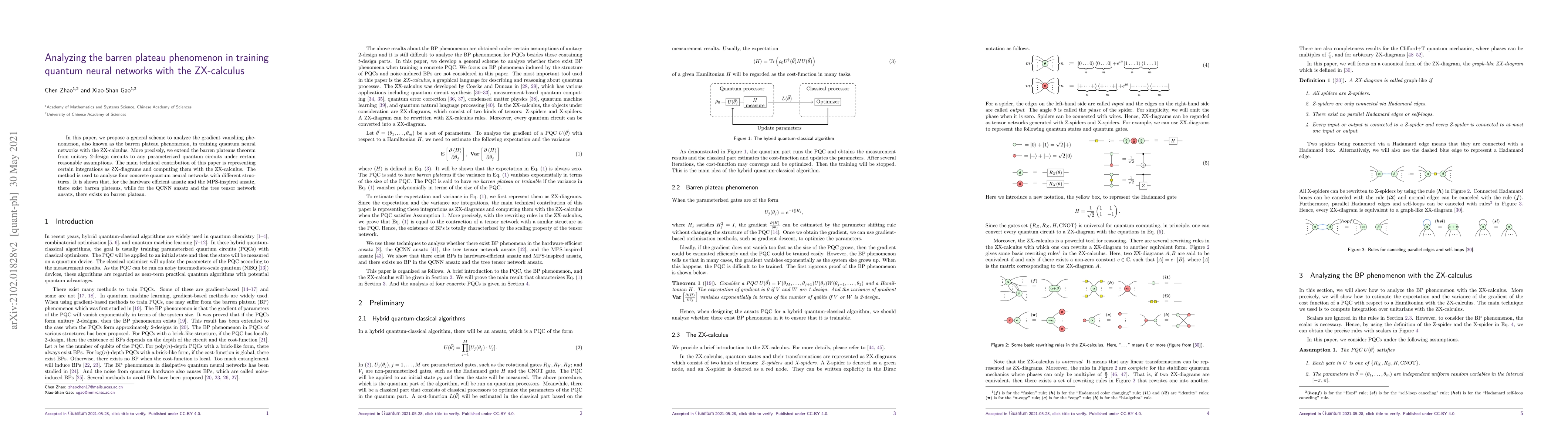 In this paper, we propose a general scheme to analyze the gradient vanishing phenomenon, also known as the barren plateau phenomenon, in training quantum neural networks with the ZX-calculus. More precisely, we extend the barren plateaus theorem from unitary 2-design circuits to any parameterized quantum circuits under certain reasonable assumptions. The main technical contribution of this paper is representing certain integrations as ZX-diagrams and computing them with the ZX-calculus. The method is used to analyze four concrete quantum neural networks with different structures. It is shown that, for the hardware efficient ansatz and the MPS-inspired ansatz, there exist barren plateaus, while for the QCNN ansatz and the tree tensor network ansatz, there exists no barren plateau.