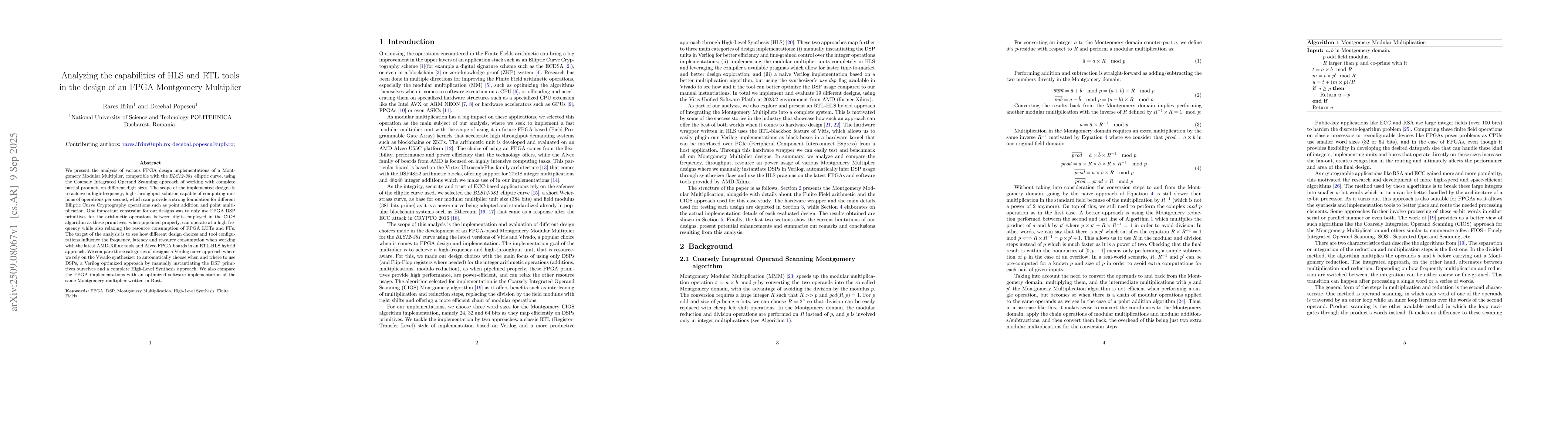 We present the analysis of various FPGA design implementations of a Montgomery Modular Multiplier, compatible with the BLS12-381 elliptic curve, using the Coarsely Integrated Operand Scanning approach of working with complete partial products on different digit sizes. The scope of the implemented designs is to achieve a high-frequency, high-throughput solution capable of computing millions of operations per second, which can provide a strong foundation for different Elliptic Curve Cryptography operations such as point addition and point multiplication. One important constraint for our designs was to only use FPGA DSP primitives for the arithmetic operations between digits employed in the CIOS algorithm as these primitives, when pipelined properly, can operate at a high frequency while also relaxing the resource consumption of FPGA LUTs and FFs. The target of the analysis is to see how different design choices and tool configurations influence the frequency, latency and resource consumption when working with the latest AMD-Xilinx tools and Alveo FPGA boards in an RTL-HLS hybrid approach. We compare three categories of designs: a Verilog naive approach where we rely on the Vivado synthesizer to automatically choose when and where to use DSPs, a Verilog optimized approach by manually instantiating the DSP primitives ourselves and a complete High-Level Synthesis approach. We also compare the FPGA implementations with an optimized software implementation of the same Montgomery multiplier written in Rust.