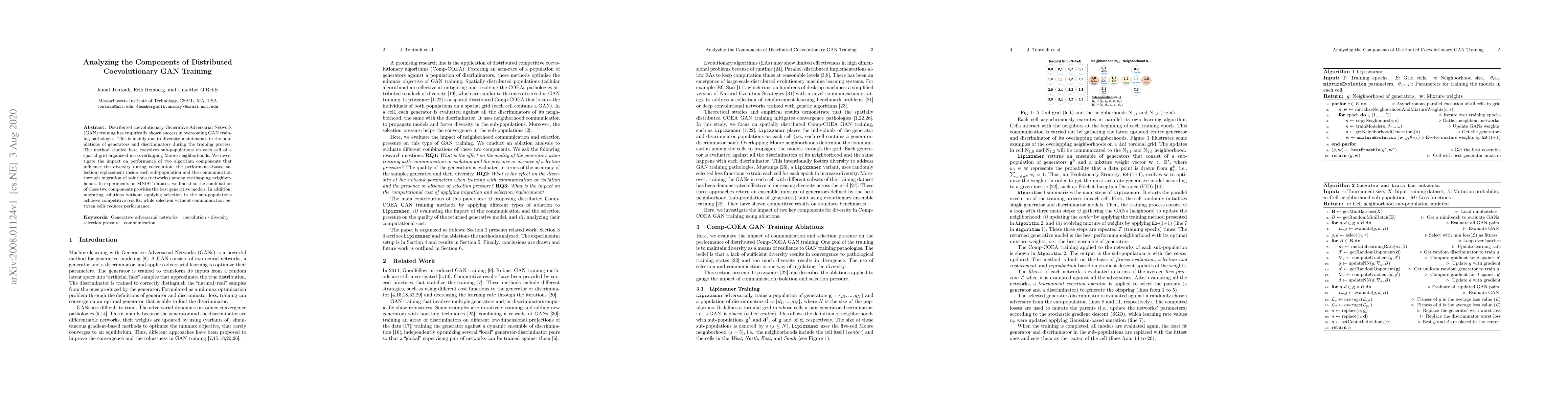 This research explores the effectiveness of distributed coevolutionary GAN training for improving generative models, focusing on the impact of performance-based selection/replacement and migration of solutions among overlapping neighborhoods. Experiments on the MNIST dataset reveal that combining these components yields the best results, while migrating solutions without selection and selection without communication also show competitive outcomes but are less effective.