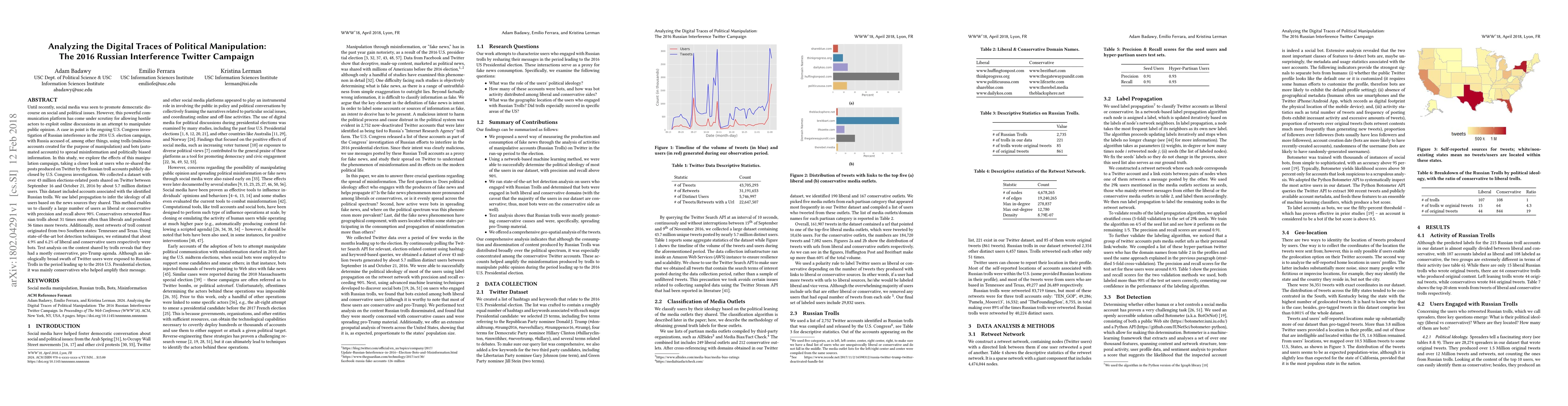 This study investigates the 2016 Russian interference Twitter campaign, analyzing over 43 million election-related posts shared by 5.7 million users, and finds that conservatives retweeted Russian trolls significantly more than liberals, with most retweets originating from Tennessee and Texas.
