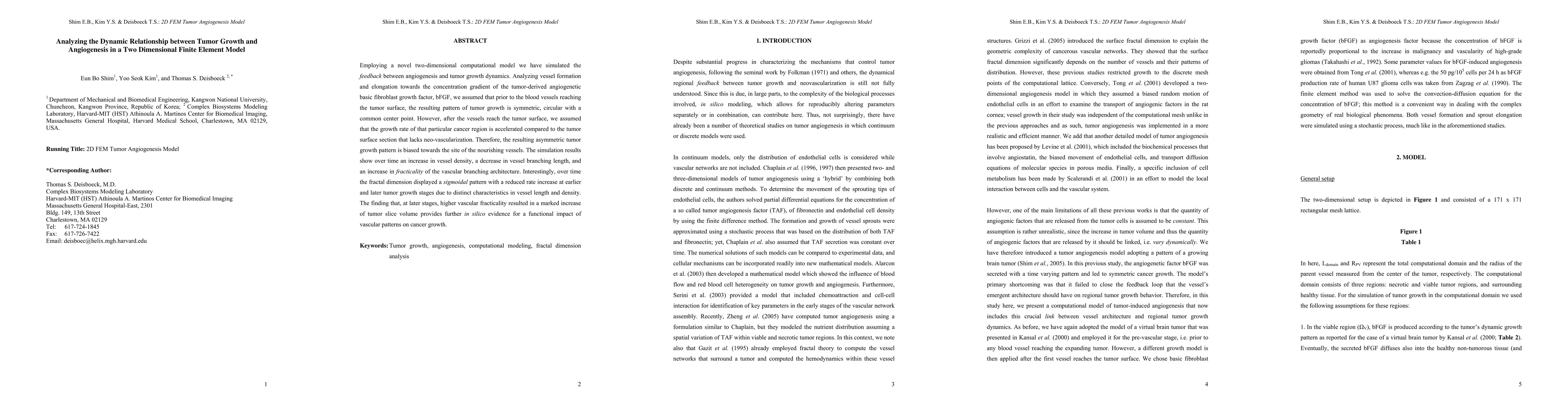 A 2D computational model shows that tumor growth is influenced by angiogenesis, with vascular patterns leading to asymmetric growth and increased tumor volume over time. Vascular fractality increases as tumors grow, suggesting a link between blood vessel structure and cancer progression.