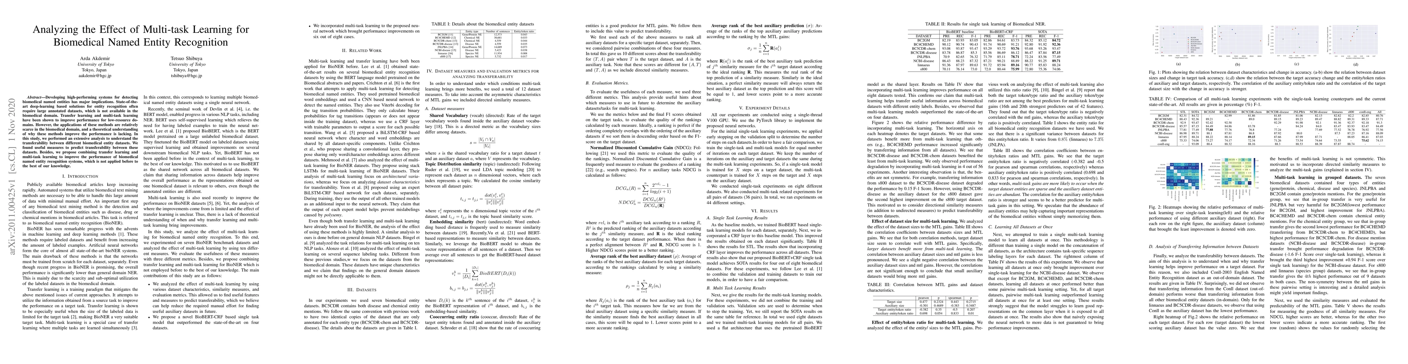 This paper explores the application of multi-task learning to improve biomedical named entity recognition, demonstrating its effectiveness through extensive analysis of transferability between datasets. The study proposes a novel combination of transfer learning and multi-task learning to enhance system performance, addressing the scarcity of large annotated datasets in the biomedical domain.