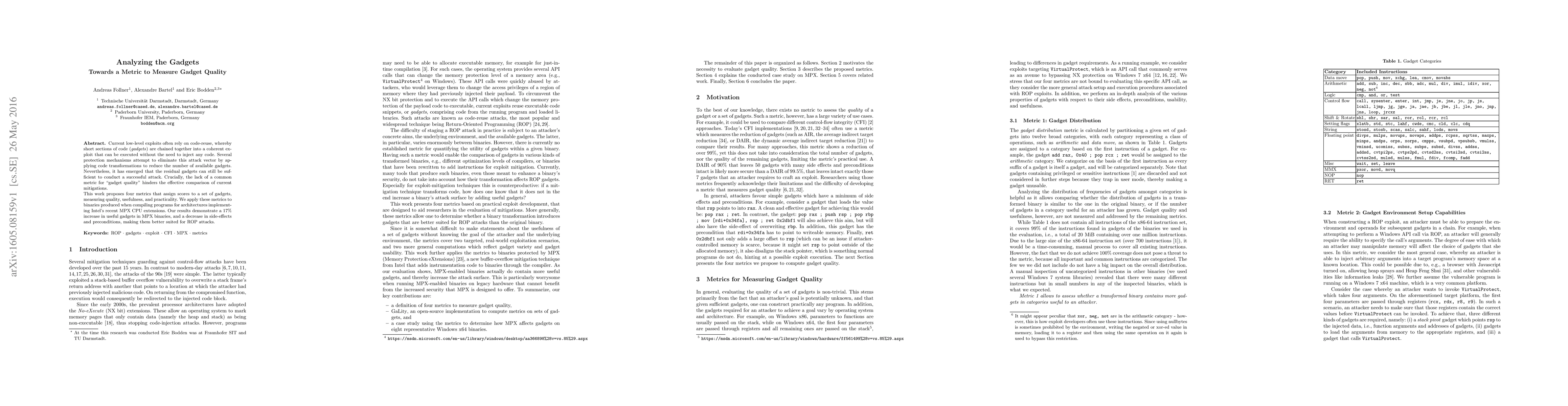 This paper proposes four metrics to evaluate the quality, usefulness, and practicality of gadgets used in low-level exploits. It demonstrates a 17% increase in useful gadgets in binaries compiled with Intel's MPX CPU extensions, showing reduced side-effects and preconditions, thus enhancing their effectiveness for return-oriented programming attacks.
