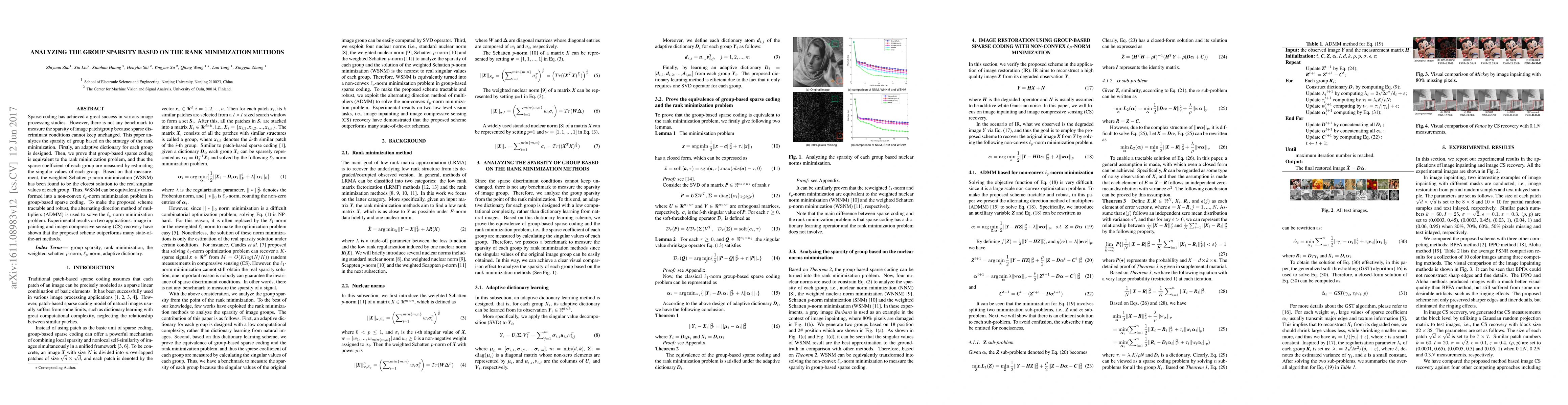 This paper proposes a method for measuring group sparsity in image processing using rank minimization. It introduces an adaptive dictionary for each group and transforms group-based sparse coding into a non-convex $\ell_p$-norm minimization problem, solved using ADMM, showing superior performance in image inpainting and compressive sensing recovery.