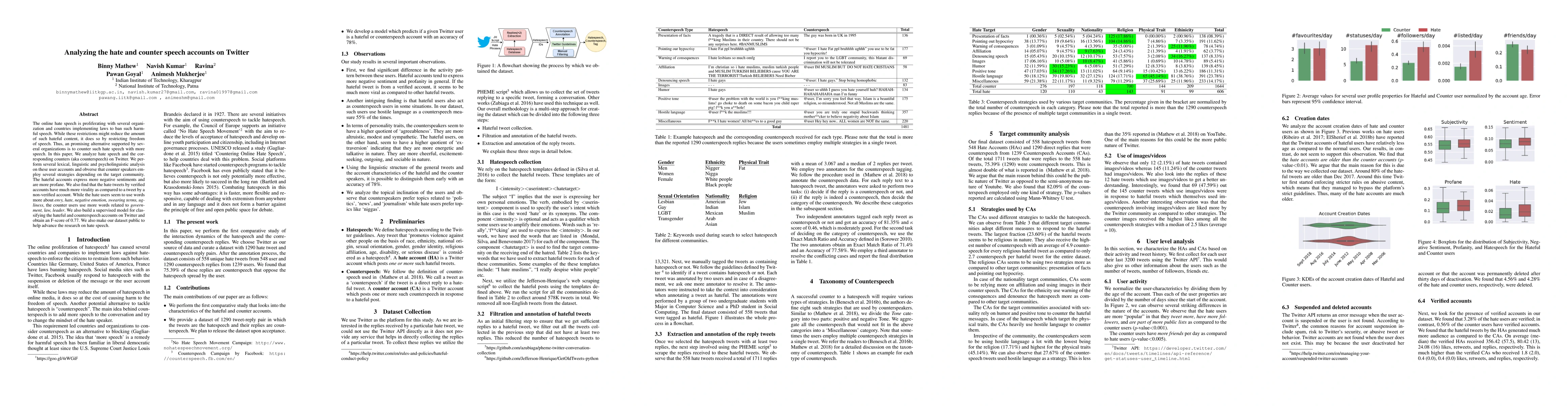 The online hate speech is proliferating with several organization and countries implementing laws to ban such harmful speech. While these restrictions might reduce the amount of such hateful content, it does so by restricting freedom of speech. Thus, an promising alternative supported by several organizations is to counter such hate speech with more speech. In this paper, We analyze hate speech and the corresponding counters (aka counterspeech) on Twitter. We perform several lexical, linguistic and psycholinguistic analysis on these user accounts and obverse that counter speakers employ several strategies depending on the target community. The hateful accounts express more negative sentiments and are more profane. We also find that the hate tweets by verified accounts have much more virality as compared to a tweet by a non-verified account. While the hate users seem to use words more about envy, hate, negative emotion, swearing terms, ugliness, the counter users use more words related to government, law, leader. We also build a supervised model for classifying the hateful and counterspeech accounts on Twitter and obtain an F-score of 0.77. We also make our dataset public to help advance the research on hate speech.