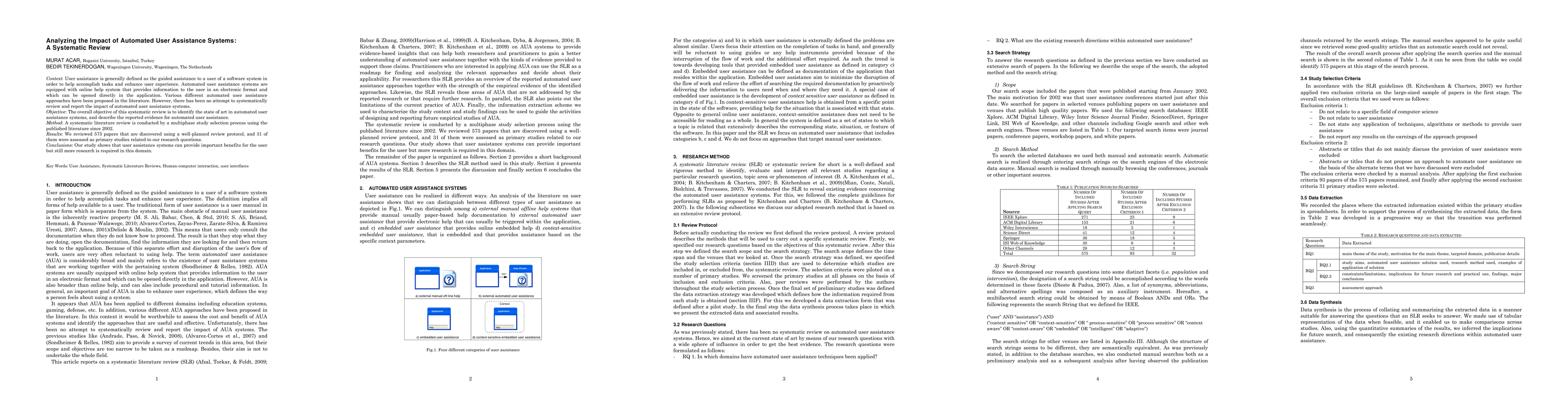 Context: User assistance is generally defined as the guided assistance to a user of a software system in order to help accomplish tasks and enhance user experience. Automated user assistance systems are equipped with online help system that provides information to the user in an electronic format and which can be opened directly in the application. Various different automated user assistance approaches have been proposed in the literature. However, there has been no attempt to systematically review and report the impact of automated user assistance systems. Objective: The overall objective of this systematic review is to identify the state of art in automated user assistance systems, and describe the reported evidence for automated user assistance. Method: A systematic literature review is conducted by a multiphase study selection process using the published literature since 2002. Results: We reviewed 575 papers that are discovered using a well-planned review protocol, and 31 of them were assessed as primary studies related to our research questions. Conclusions: Our study shows that user assistance systems can provide important benefits for the user but still more research is required in this domain.