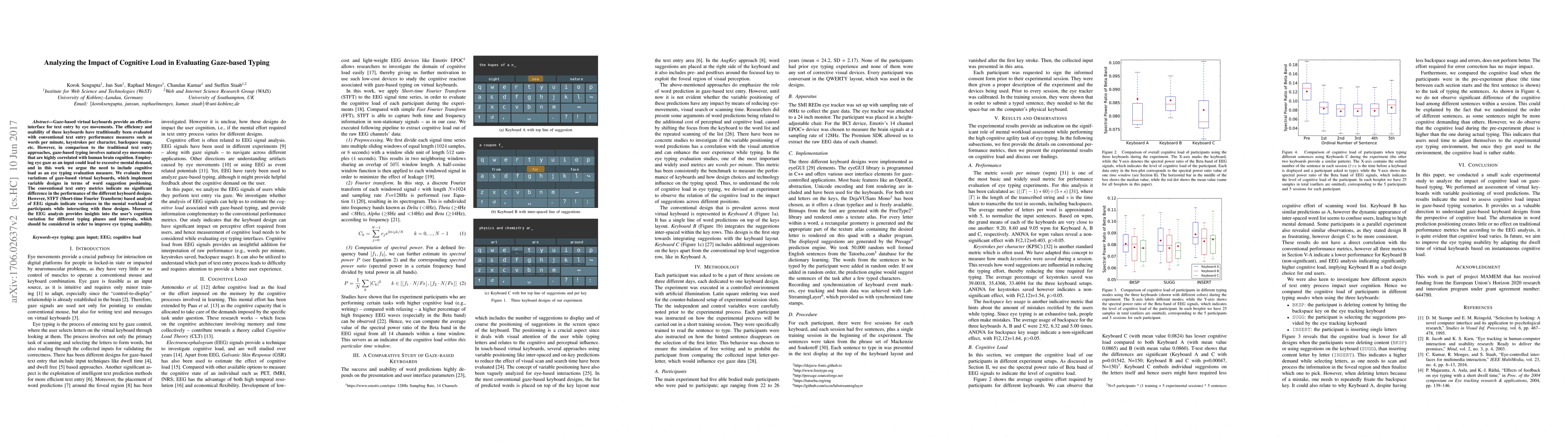 This study evaluates the impact of cognitive load on gaze-based virtual keyboards, finding that while conventional metrics show no significant performance differences, EEG analysis reveals varying mental workloads among designs. The findings suggest cognitive load should be included in evaluating eye typing usability.