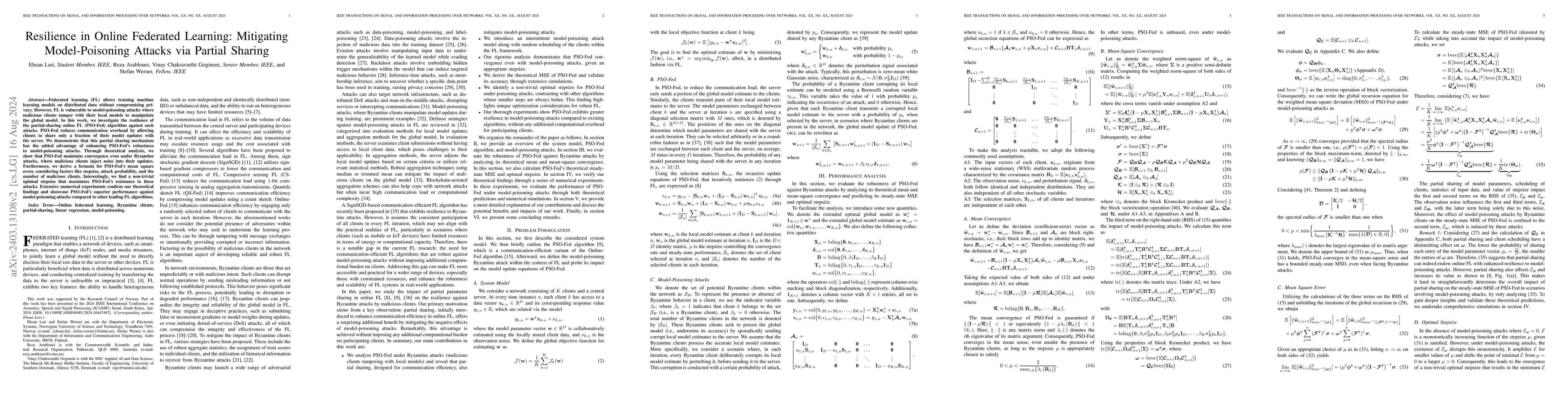 This paper analyzes the resilience of the partial-sharing online federated learning (PSO-Fed) algorithm against model-poisoning attacks, demonstrating its convergence and performance under Byzantine clients. It concludes that PSO-Fed maintains optimal convergence even with poisoning, outperforming other algorithms.